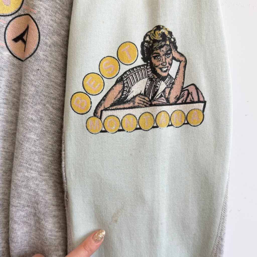 Best Montana トレーナー スウェット 裏起毛 フロントプリント 2面プリント 切り替えデザイン モックネック 黄緑×グレー No.J353