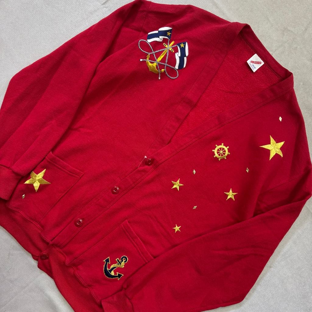 USA製 JERZEES アメリカ製 ジャージーズ スウェット カーディガン マリン 星 刺繍 ポケット付き 赤 ONE SIZE No.E363