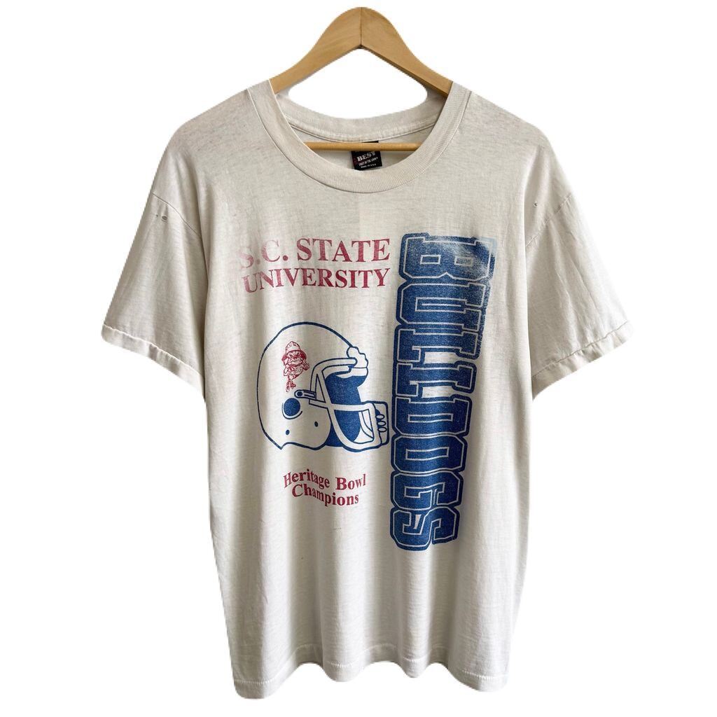 USA製 FRUIT OF THE LOOM フルーツオブザルーム ボロ BULLDOGS ブルドッグス FOOTBALL フットボール 2面プリント バックプリント シングルステッチ 半袖Tシャツ 白 Lサイズ No.Y150
