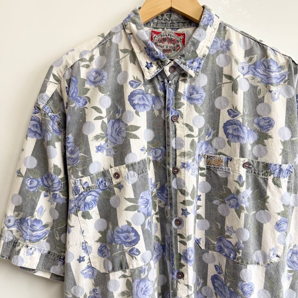 ASHANTI 花柄 水玉 ドット柄 ストライプ 総柄 柄シャツ デザインシャツ 半袖シャツ 白×グレー×青 XLサイズ No.Y164