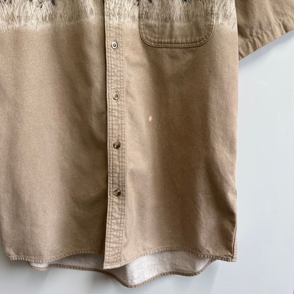 Cabela's カベラス アニマルプリント 犬 鳥 草原 アート ボタンダウンシャツ デザインシャツ 半袖シャツ ベージュ×多色 Lサイズ No.Y166