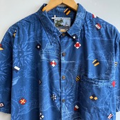 USA製 AFTCO BLUE WATER 船 総柄 柄シャツ デザインシャツ 半袖シャツ 胸ポケット付き 青×多色 サイズ2X No.Y216