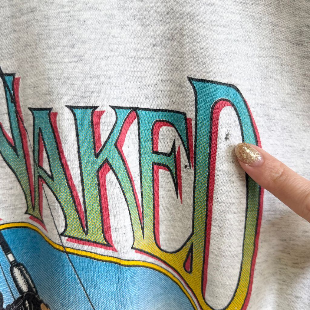90's USA製 FRUIT OF THE LOOM フルーツオブザルーム ボロ 両面プリント パロディ アウトドア イラスト fishing シングルステッチ 半袖Tシャツ ライトグレー XXLサイズ No.Y399