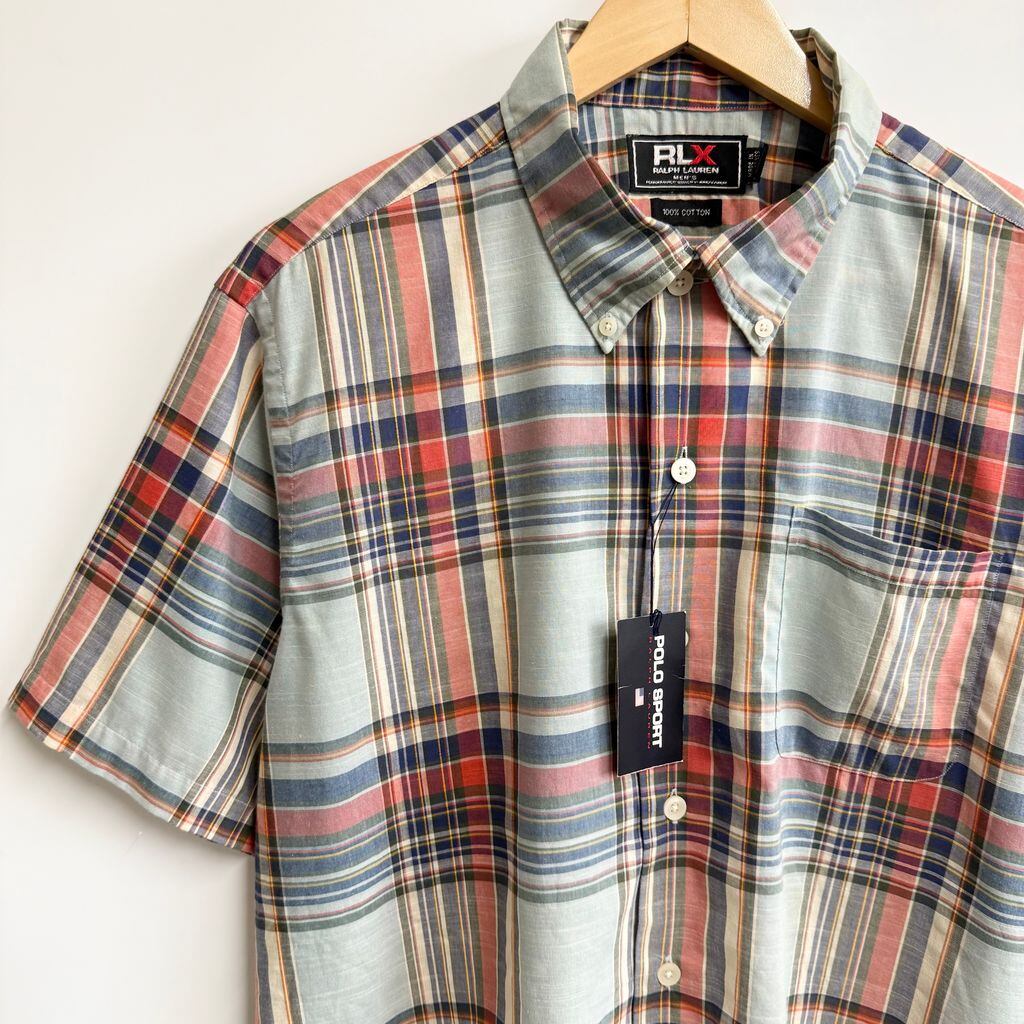 (デッドストック) RLX RALPH LAUREN ラルフローレン ボタンダウンシャツ コットンシャツ チェック柄 ポケット付き 半袖シャツ 水色系×多色 Lサイズ No.Y499