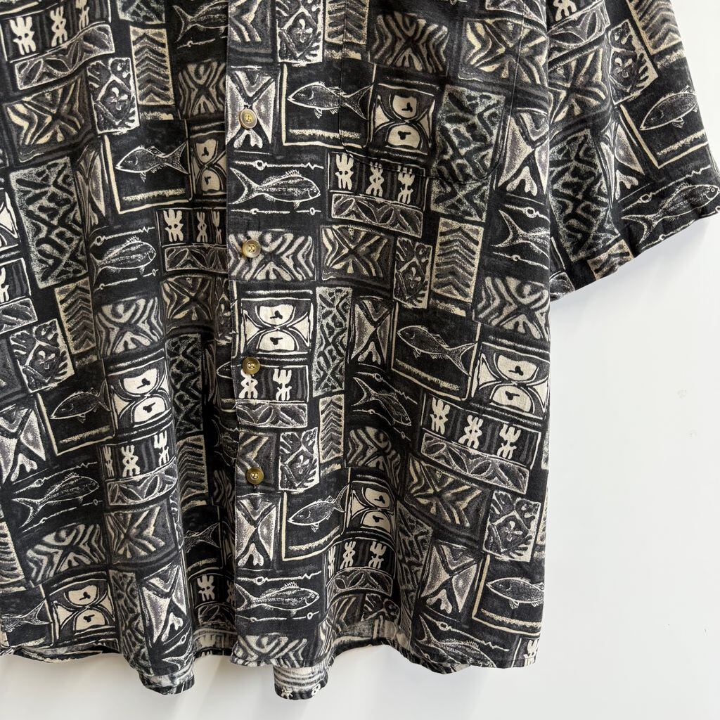 FIELD&STREAM 幾何学模様 魚 fish 総柄 柄シャツ デザインシャツ 半袖シャツ 胸ポケット付き 黒×白×グレー×ベージュ XLサイズ No.Y535
