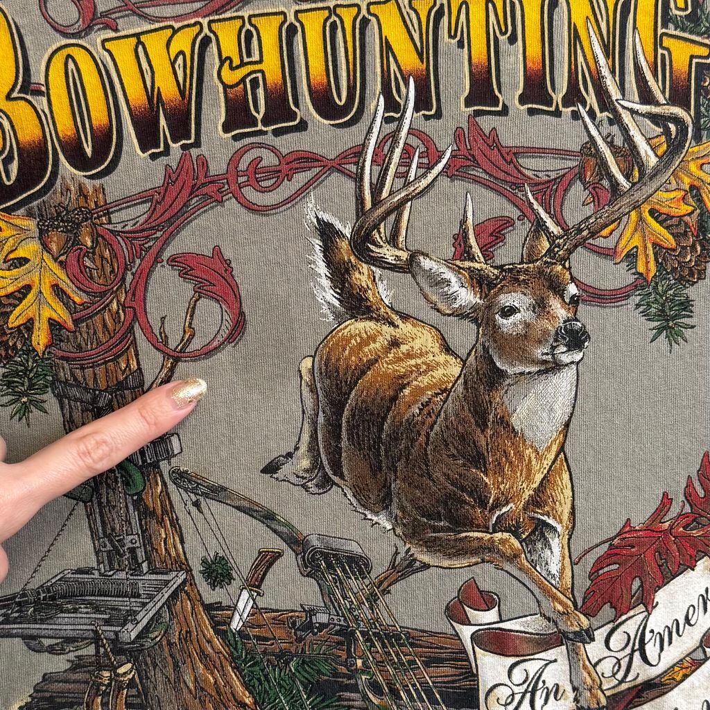 90's USA製 Tee Jays シカ アニマルプリント BOWHUNTING ハンティング シングルステッチ 半袖Tシャツ カーキ XLサイズ No.Y572