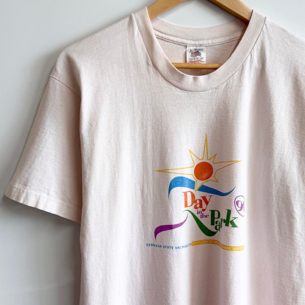 USA製 FRUIT OF THE LOOM フルーツオブザルーム Day in the Park 太陽 アート シングルステッチ 半袖Tシャツ 薄ピンク×カラフル Lサイズ No.Y588