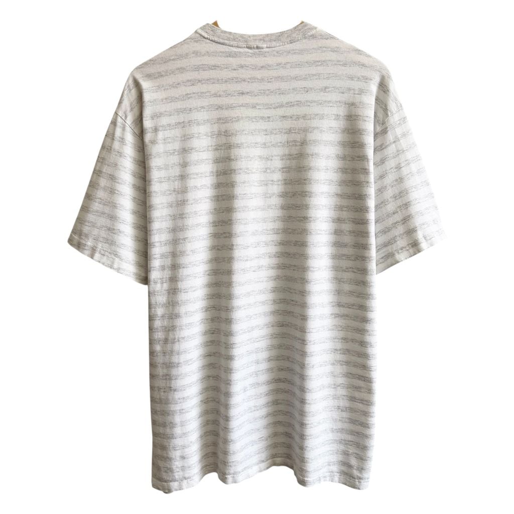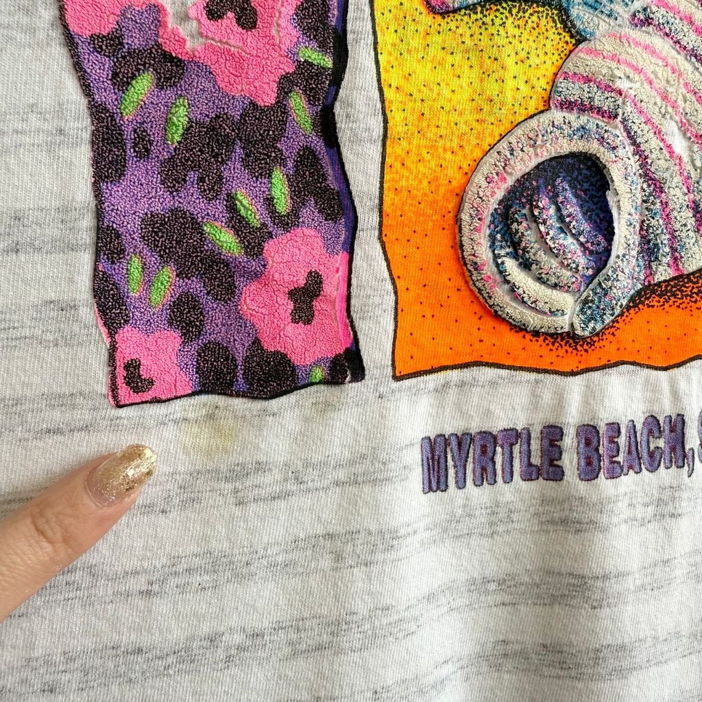 90's 貝殻 アート 花柄 POP ポップ BEACH ビーチ ボーダー シングルステッチ 半袖Tシャツ 白×グレー×カラフル No.Y602