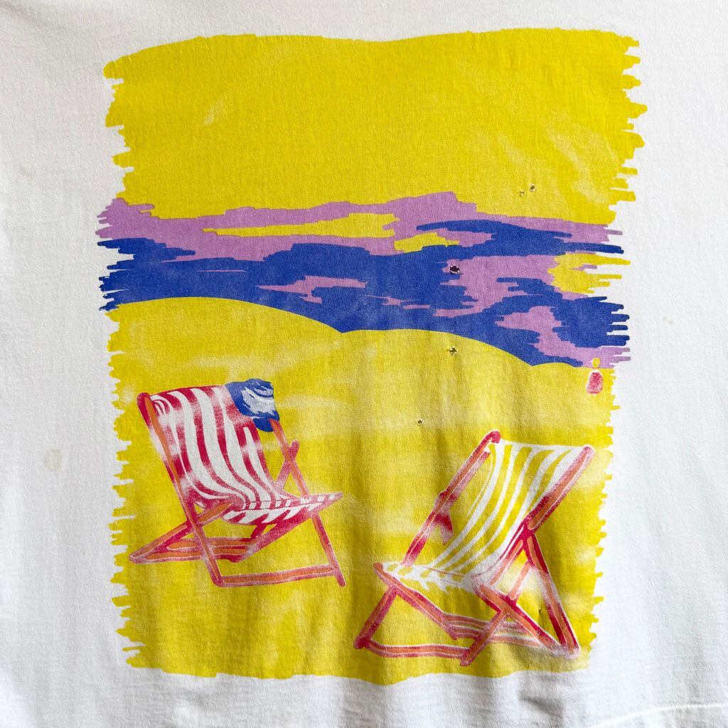 リメイク ボロ カットオフ ノースリーブTシャツ ビーチチェア BEACH フロントプリント 白×カラフル No.Y603