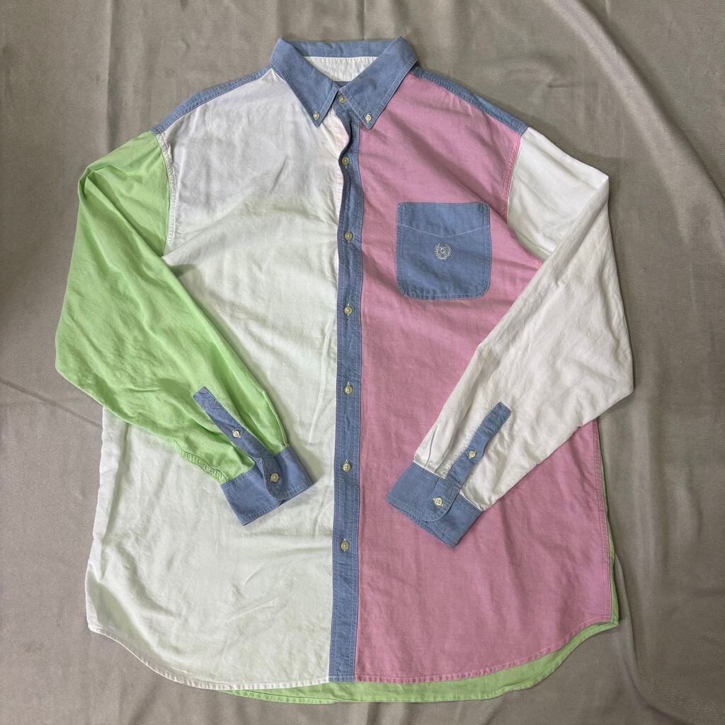 CHAPS チャップス 長袖シャツ シャツ 胸ポケット ワンポイント 白×ピンク×緑 2XLNo.W020