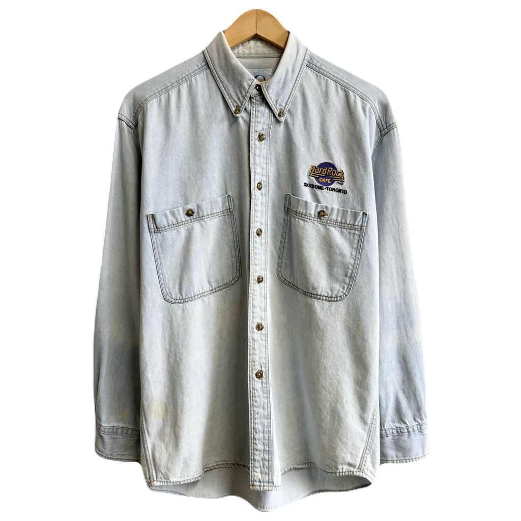 Hard Rock CAFE ハードロックカフェ デニムシャツ ボタンダウンシャツ ロゴ刺繍 コットンシャツ ポケット付き 長袖シャツ ライトブルー 青 Sサイズ No.Y696