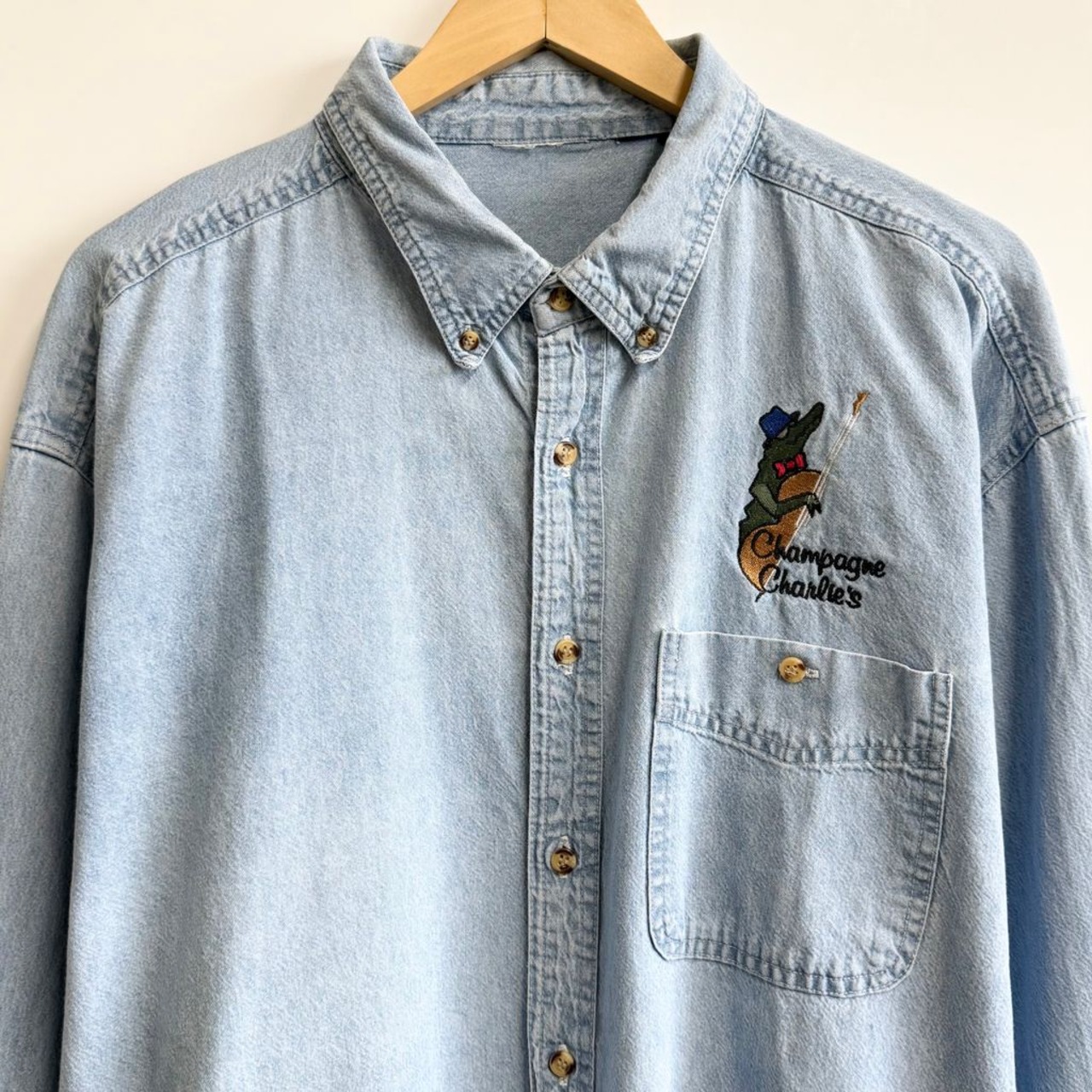 デニムシャツ ボタンダウンシャツ Champagne Charlies アニマル 刺繍 胸ポケット付き 長袖シャツ ライトブルー 青 No.Y698