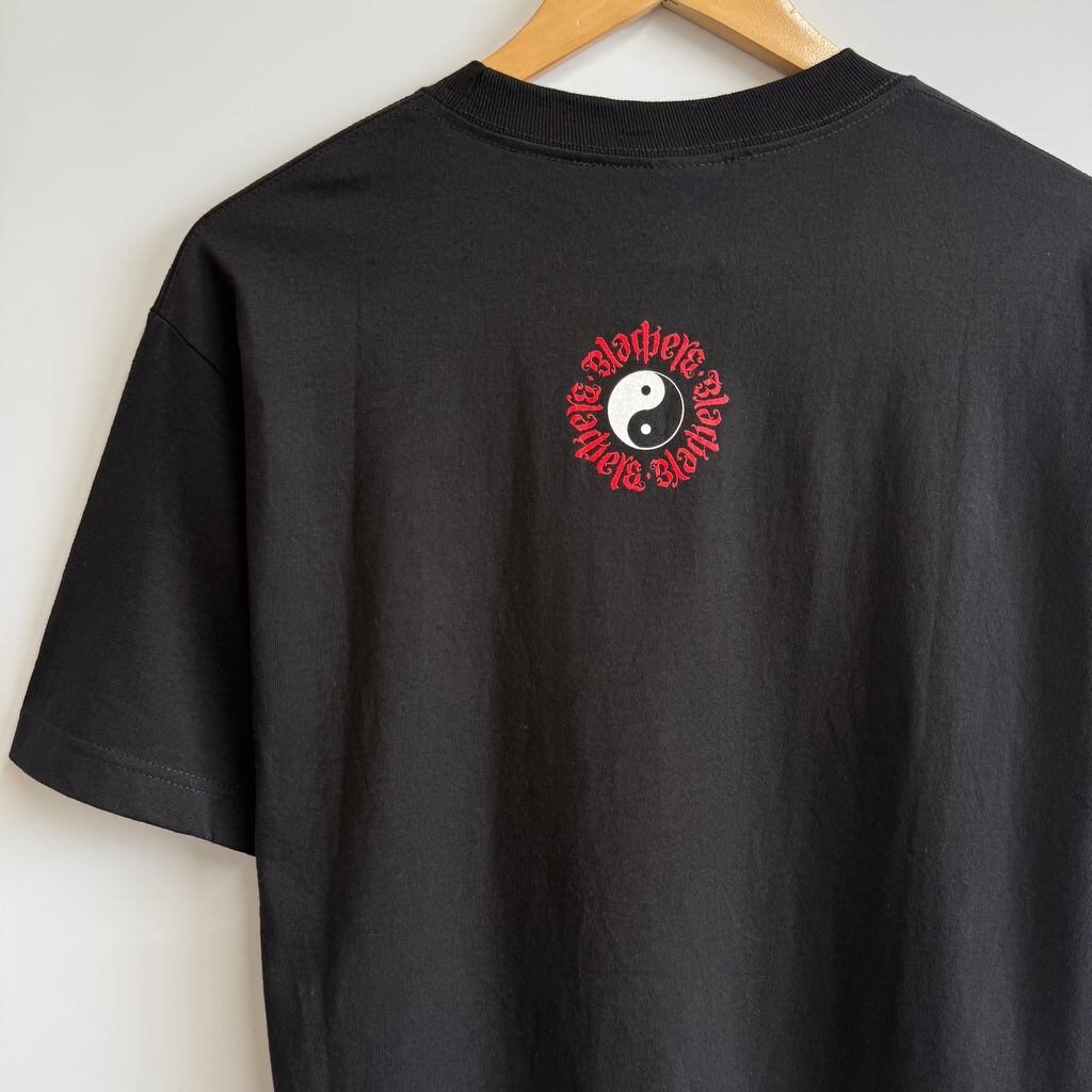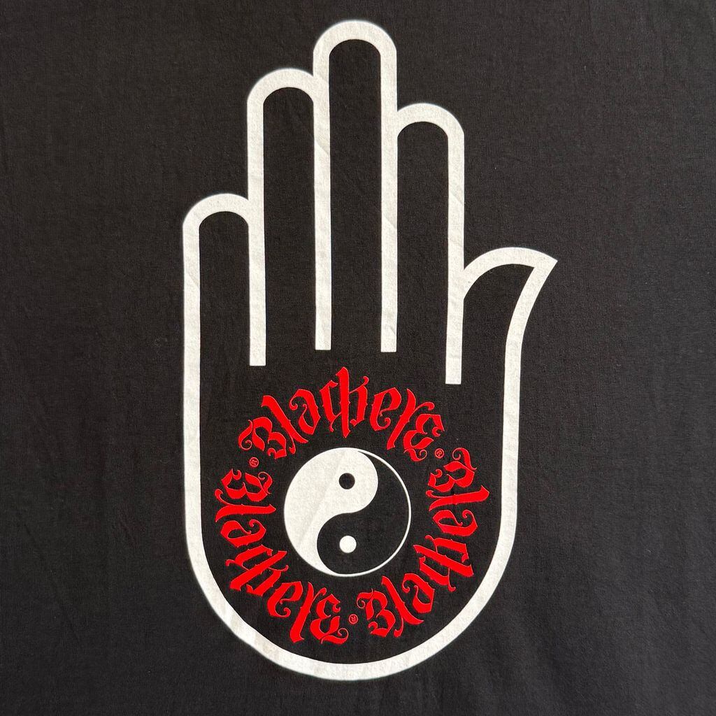 (デッドストック) BLACK EYE 陰陽マーク 手 ロゴプリント 両面プリント バックプリント 半袖Tシャツ 黒 ブラック Mサイズ No.Y702