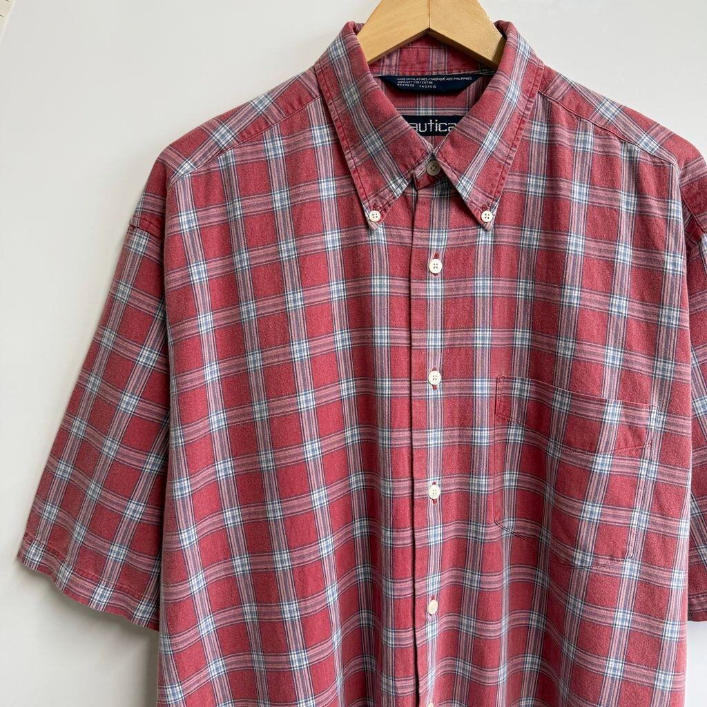 NAUTICA ノーティカ コットンシャツ チェック柄 ポケット付き 半袖シャツ エンジ×白×青 Lサイズ No.Y719