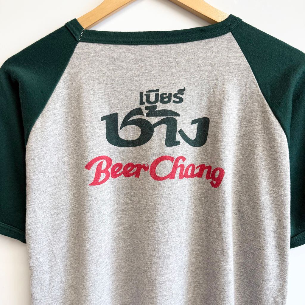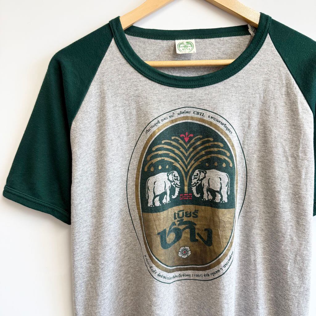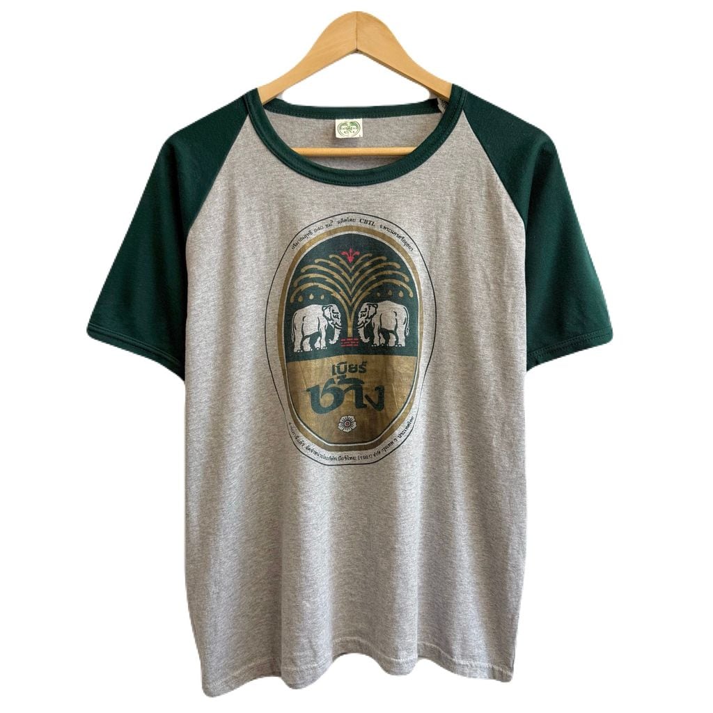 Chang Beer チャーンビール タイ ビール ゾウ アニマルプリント 半袖Tシャツ 緑×グレー No.Y769