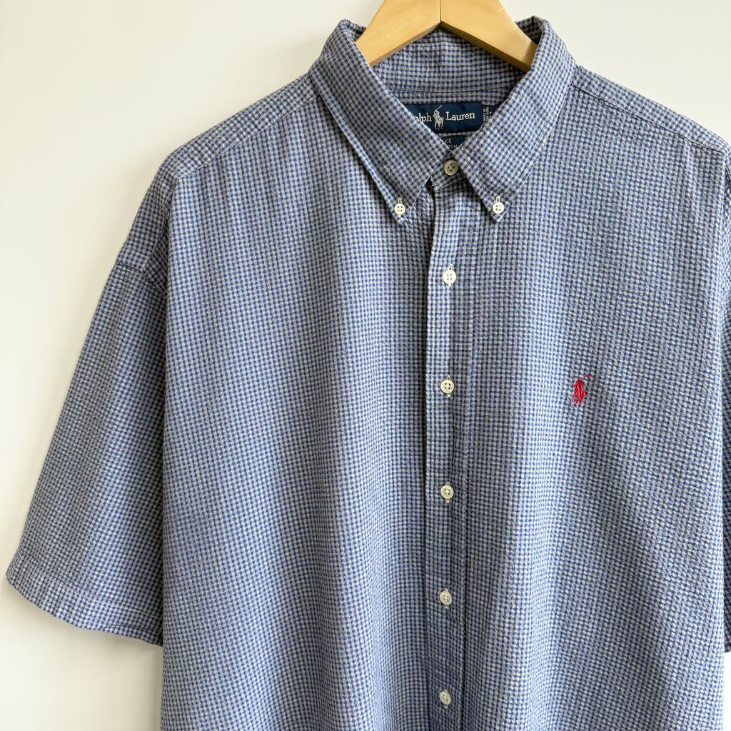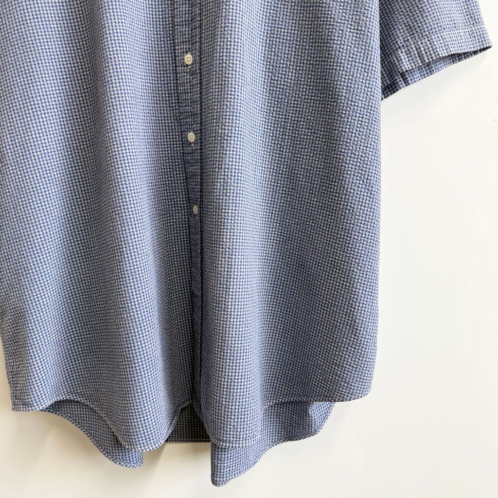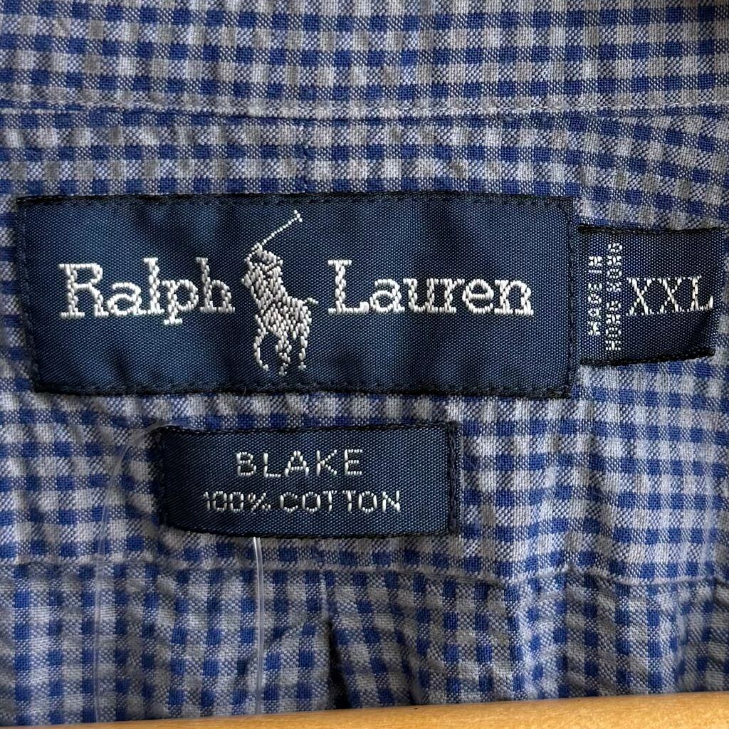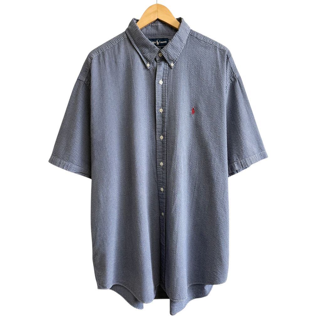 Ralph Lauren ラルフローレン BLAKE シアサッカー ボタンダウンシャツ コットンシャツ チェック柄 半袖シャツ ワンポイントロゴ 刺繍 青×グレー XXLサイズ No.Y809