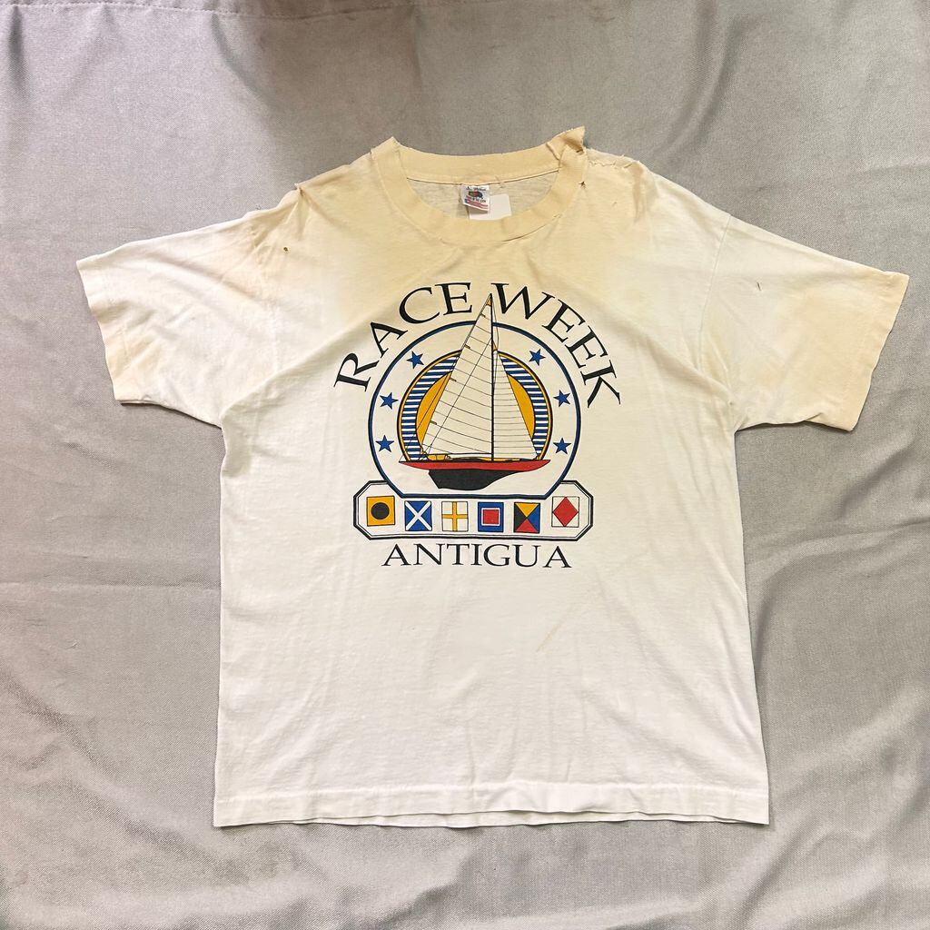 FRUIT OF THE ROOM made in USA Tシャツ RACE WEEK ANTIGUA 船 ヨット 白×黄色×青×黒 white×yellow×blue×black SIZE L No.T027