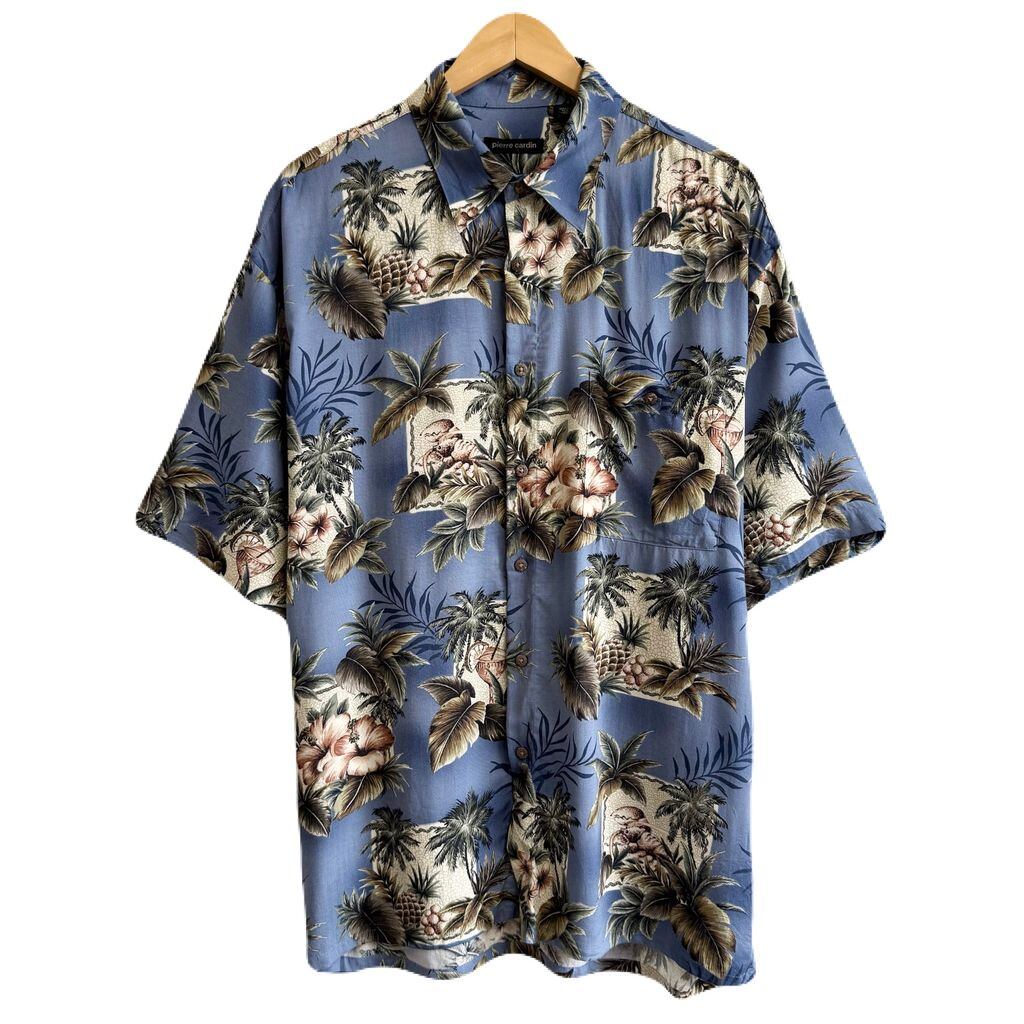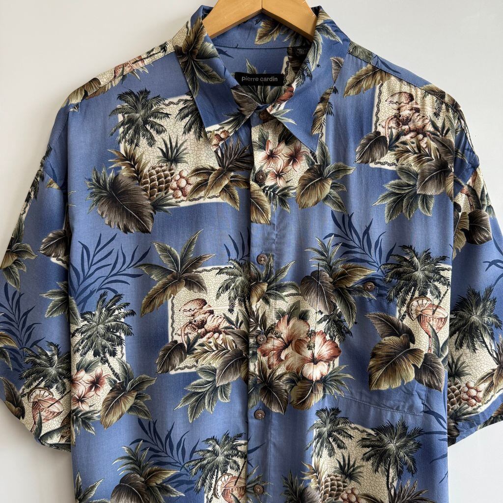 Pierre cardin レーヨンシャツ ヤシの木 ハイビスカス アロハシャツ 総柄 柄シャツ 半袖シャツ 青×多色 Lサイズ No.Y942