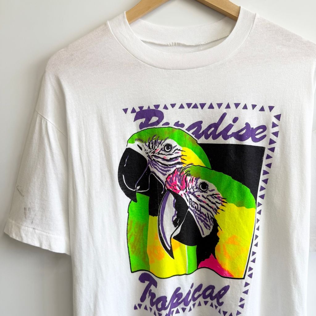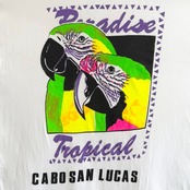 〜90's アニマルプリント オウム 鳥 CABOSAN LUCAS カボサンルカス シングルステッチ 半袖Tシャツ 白×カラフル No.Y973