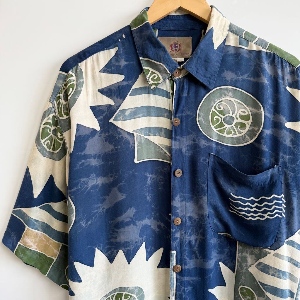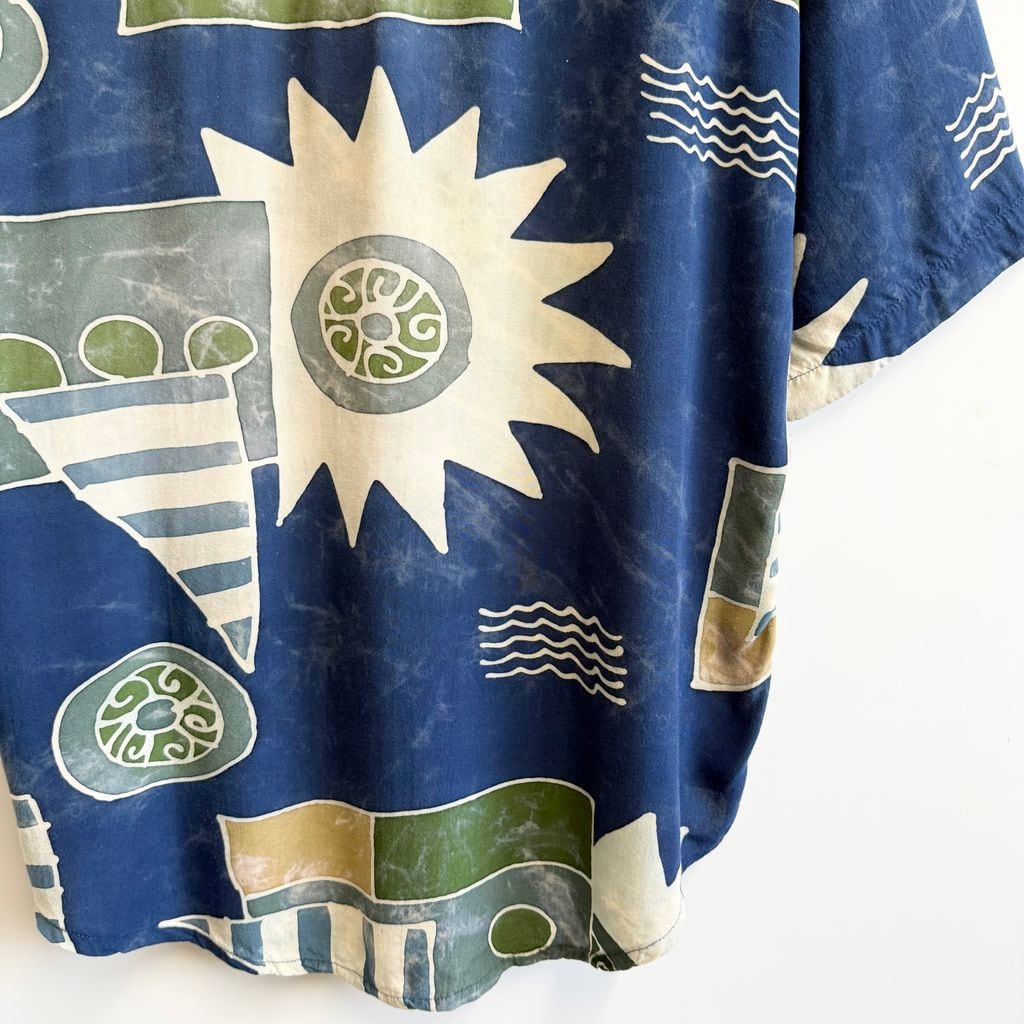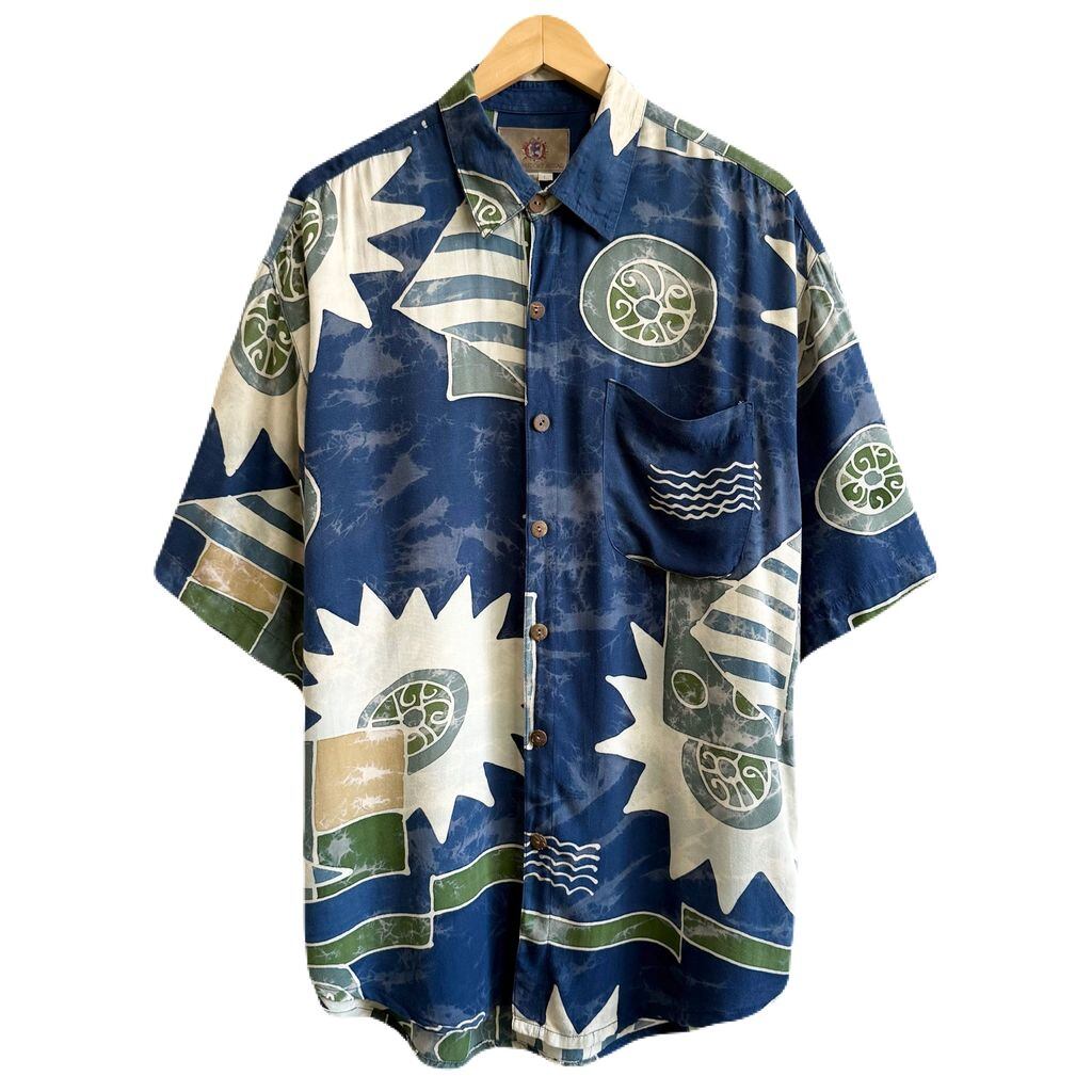 THE TERRITORY AHEAD レーヨンシャツ アート 総柄 柄シャツ デザインシャツ 半袖シャツ 胸ポケット付き 青×多色 Lサイズ No.G076