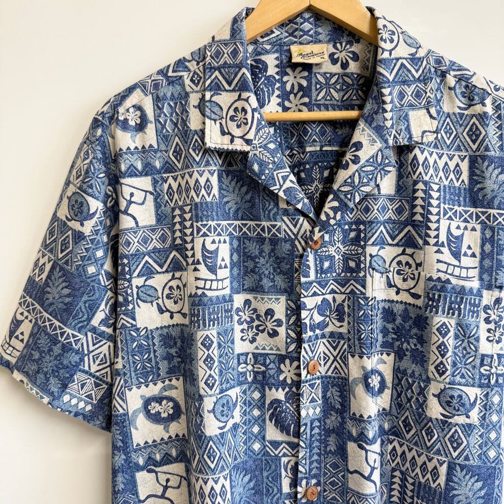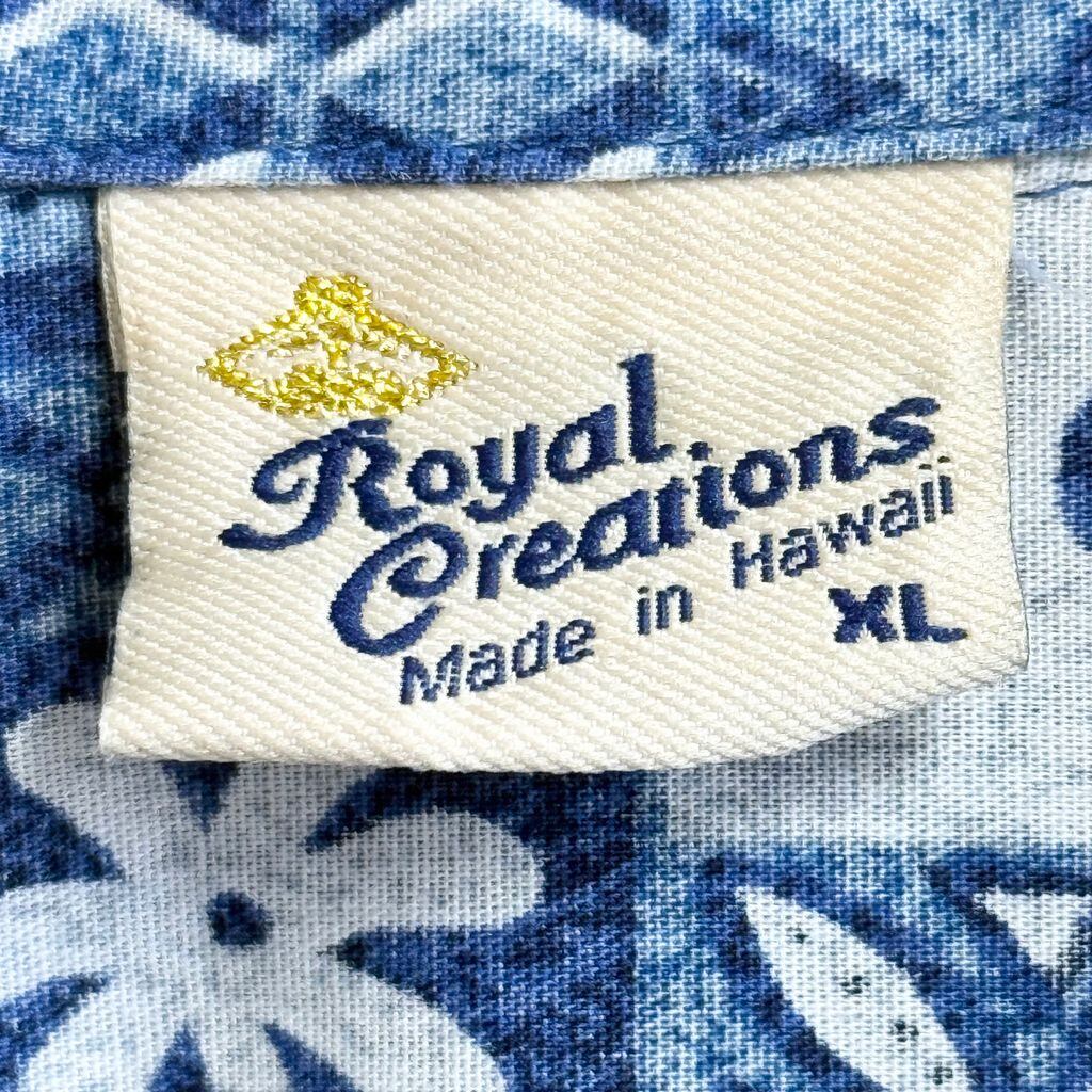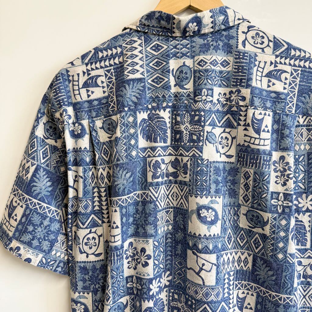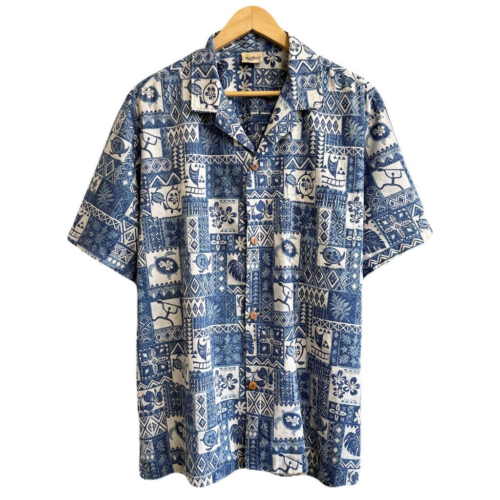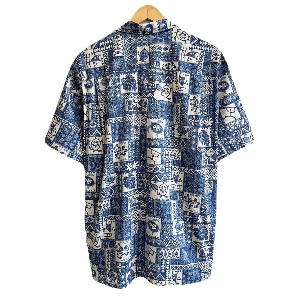 ハワイ製 Royal Creations アロハシャツ ハワイアンシャツ ハイビスカス ウミガメ ボタニカル 植物 オープンカラー 開襟シャツ 青×白×水色 XLサイズ No.G078