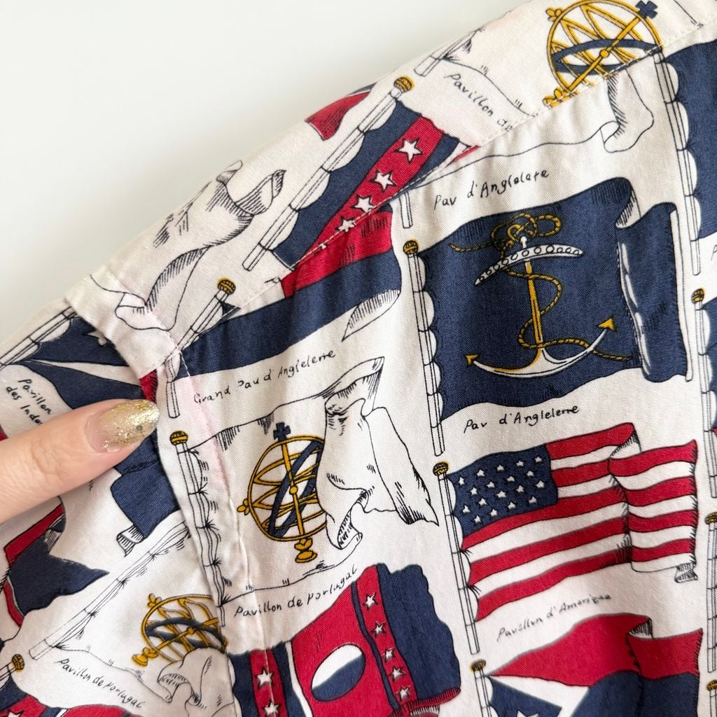 USA製 Cambridge Ltd. ボタンダウンシャツ 旗 Flags 総柄 柄シャツ 半袖シャツ コットンシャツ 白×赤×青×多色 Lサイズ No.G108