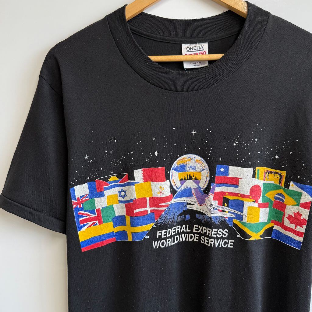 90's USA製 ONEITA オニータ 国旗 flag 地球 宇宙 航空機 山 シングルステッチ 半袖Tシャツ 黒 Lサイズ No.G129