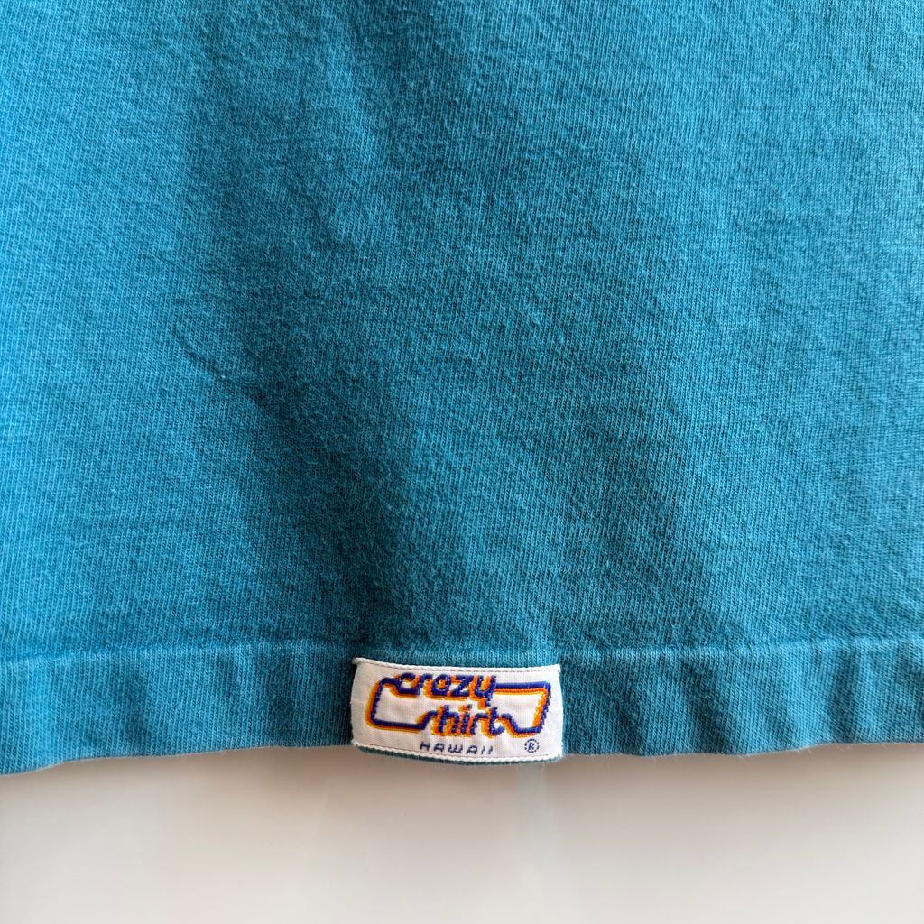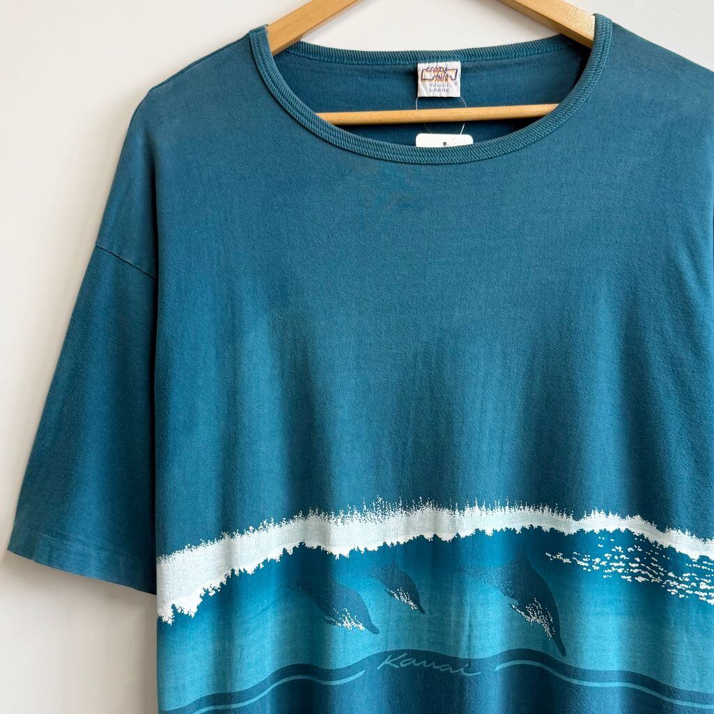 90's USA製 Crazy Shirts クレイジーシャツ イルカ アニマルプリント 波 両面プリント Kauai カウアイ シングルステッチ 半袖Tシャツ 青緑 あおみどり Lサイズ No.G175