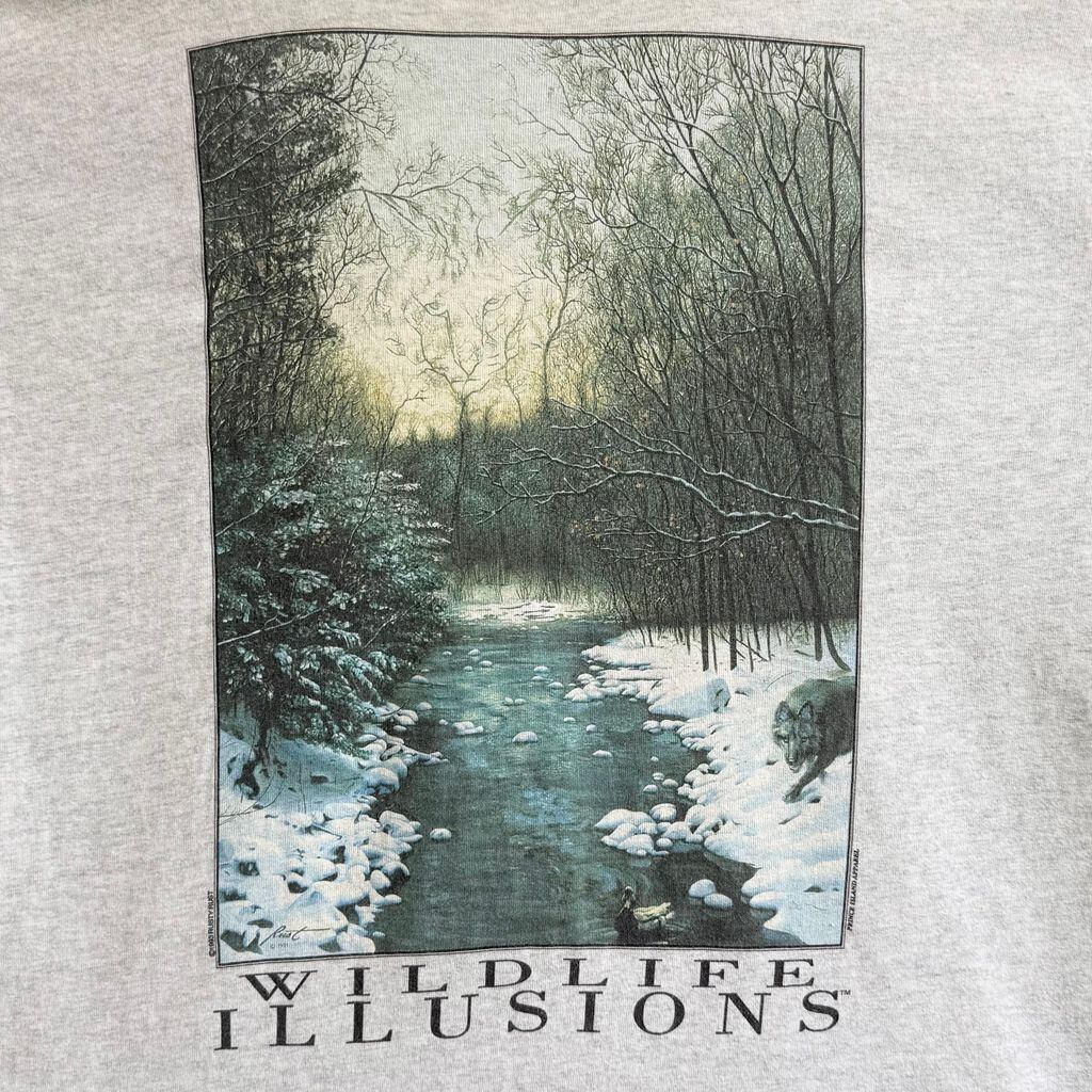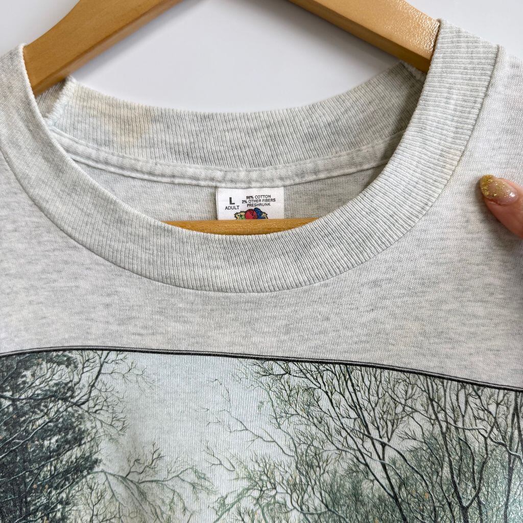 90's USA製 FRUIT OF THE LOOM フルーツオブザルーム 風景 隠し絵 雪 オオカミ グラフィック シングルステッチ 半袖Tシャツ ライトグレー Lサイズ No.G186