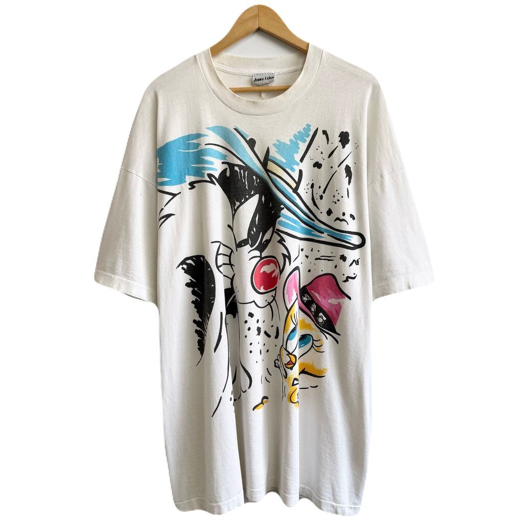 90's JERRY LEiGH オーバープリント ルーニーチューンズ キャラクターTシャツ シルベスターキャット トゥイーティー シングルステッチ 半袖Tシャツ 白 No.G190
