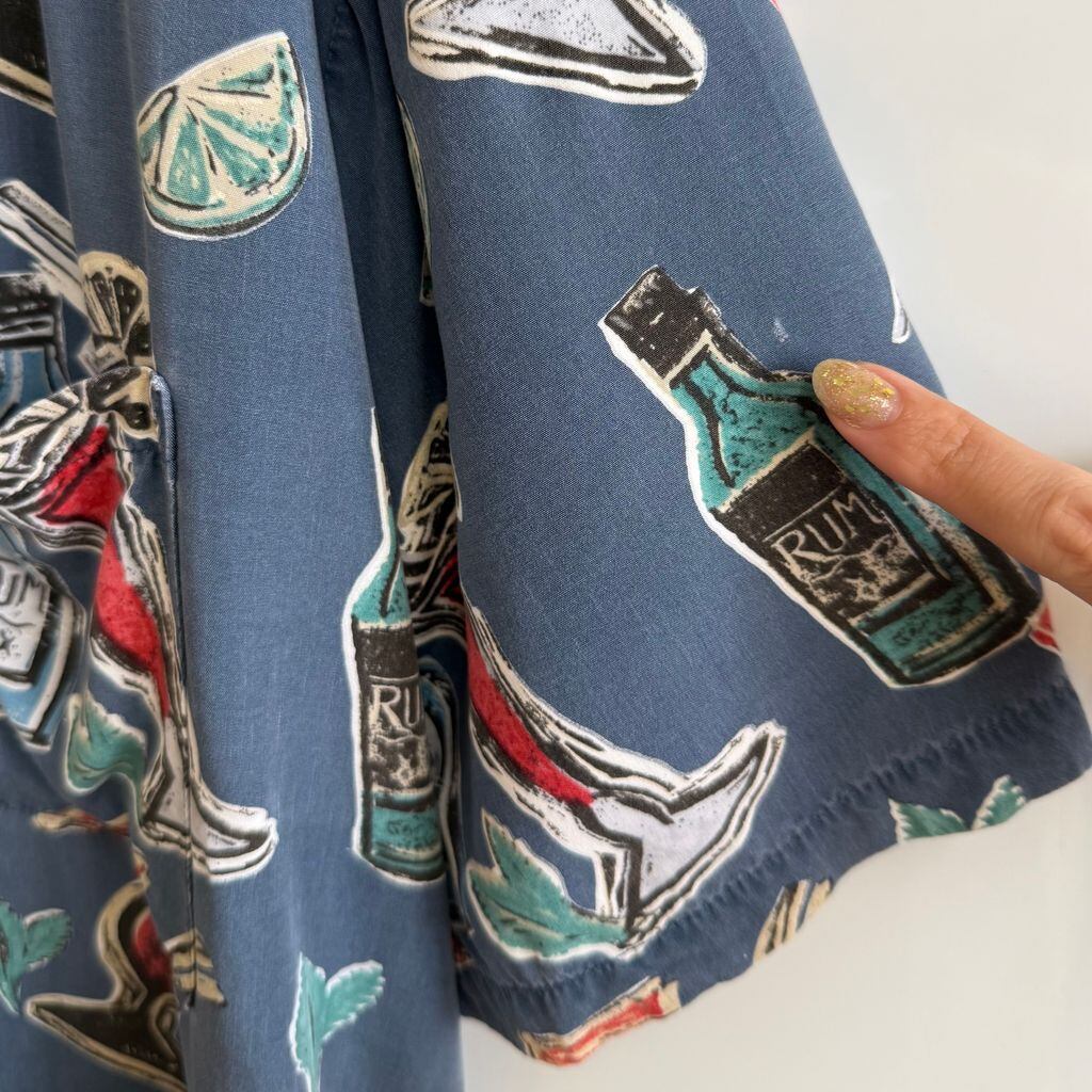 KAHALA レーヨンシャツ カクテル お酒 ラム フルーツ 総柄 柄シャツ デザインシャツ 半袖シャツ 青系×多色 Lサイズ No.G363