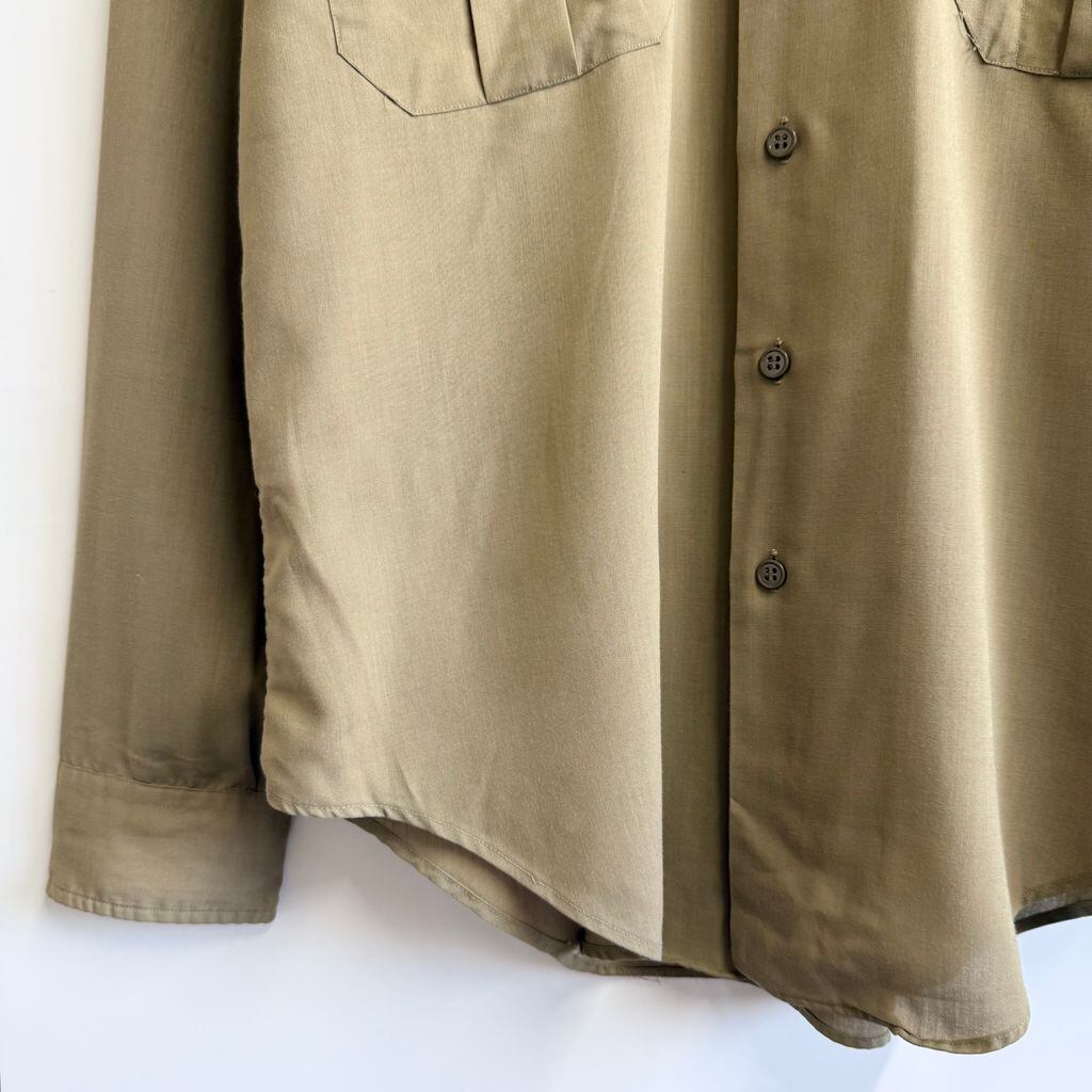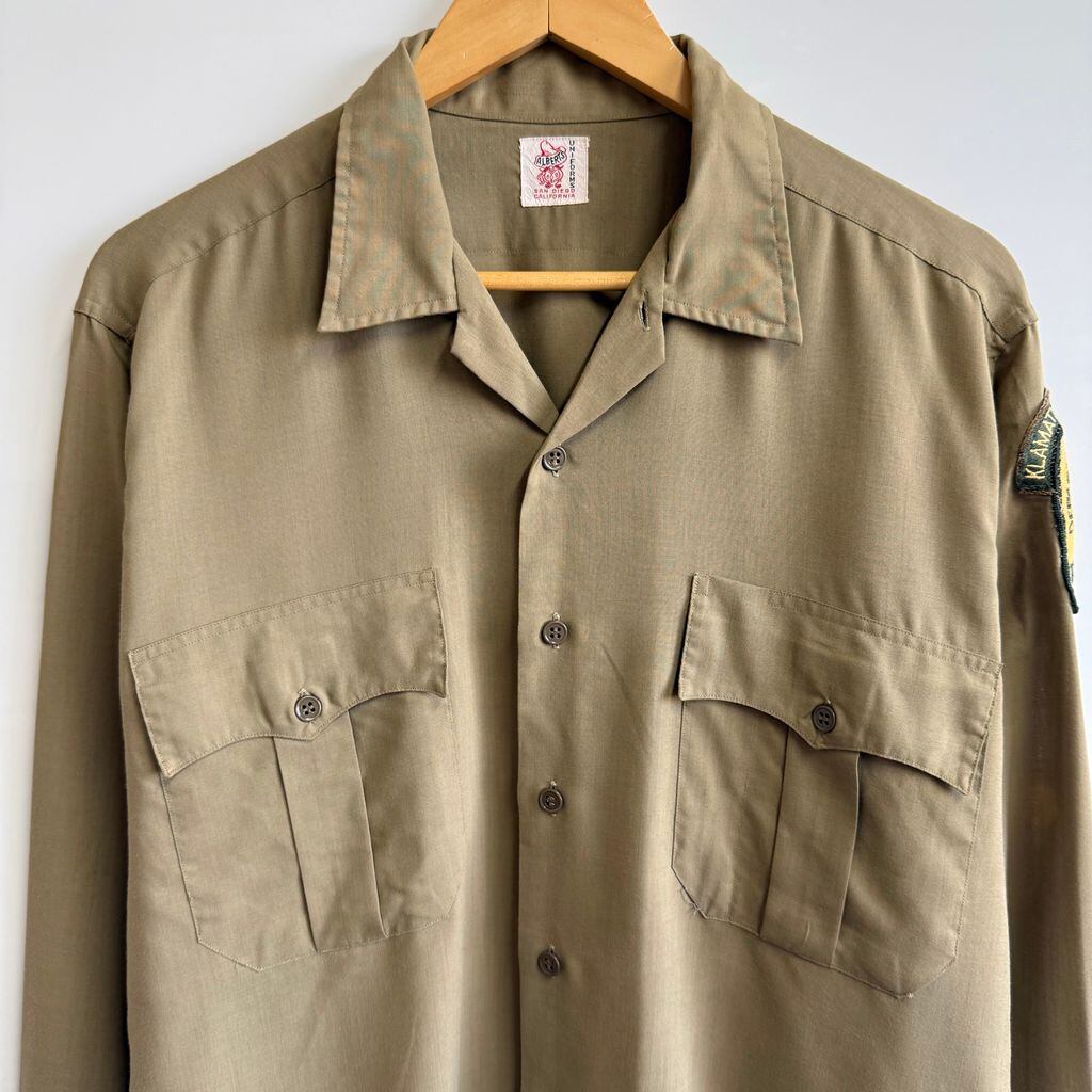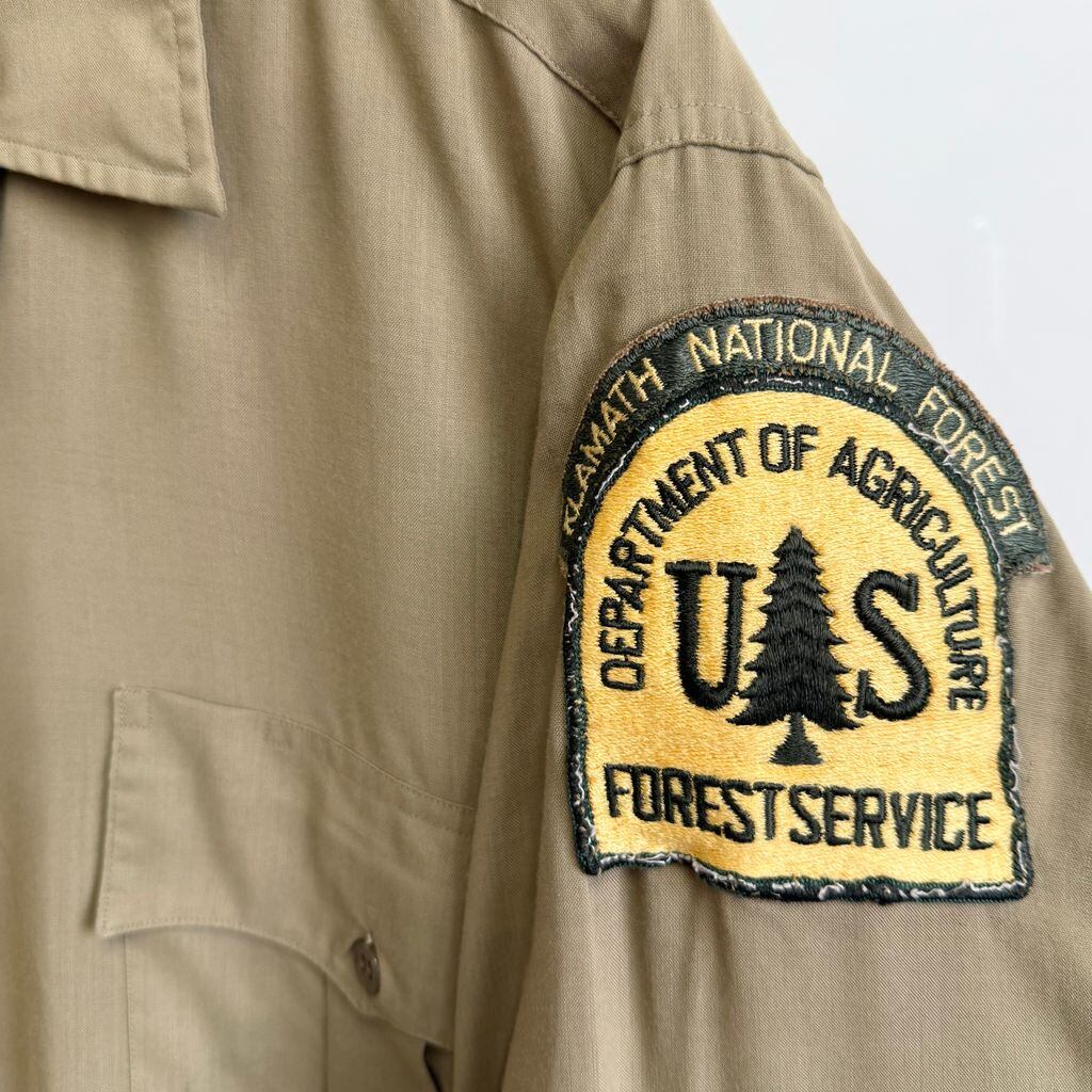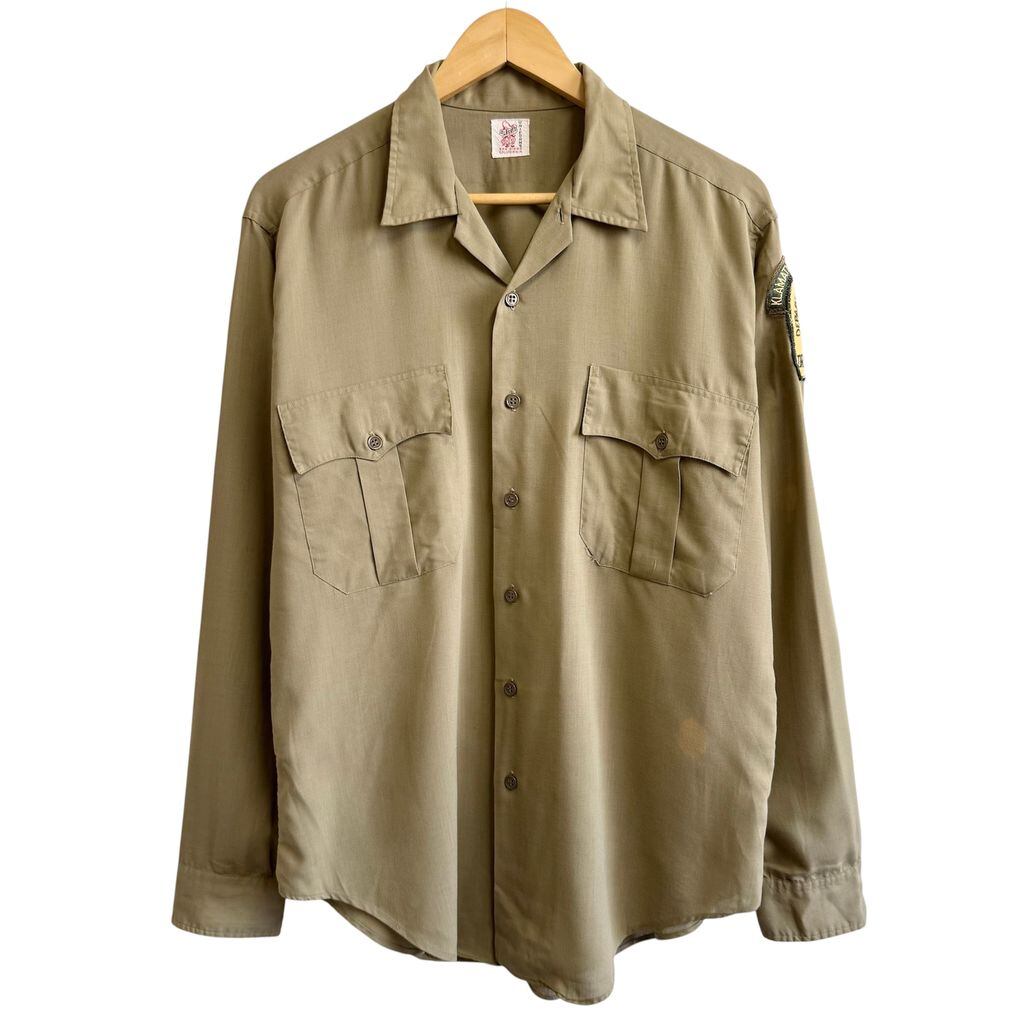 60's〜70's USA製 ALBERTS UNIFORMS ビンテージ vintage ワッペン US FOREST SERVICE パッチ オープンカラー 開襟シャツ 長袖シャツ ベージュ カーキ系 No.G391