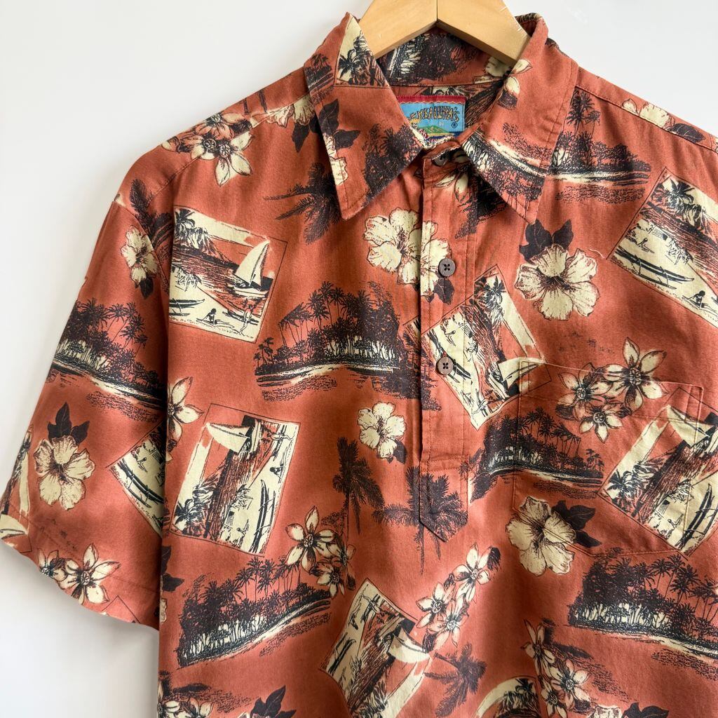 Reyn Spooner レインスプーナー プルオーバー ハーフボタン ヤシの木 ハイビスカス 半袖シャツ 茶×黒×白系 Mサイズ No.G465