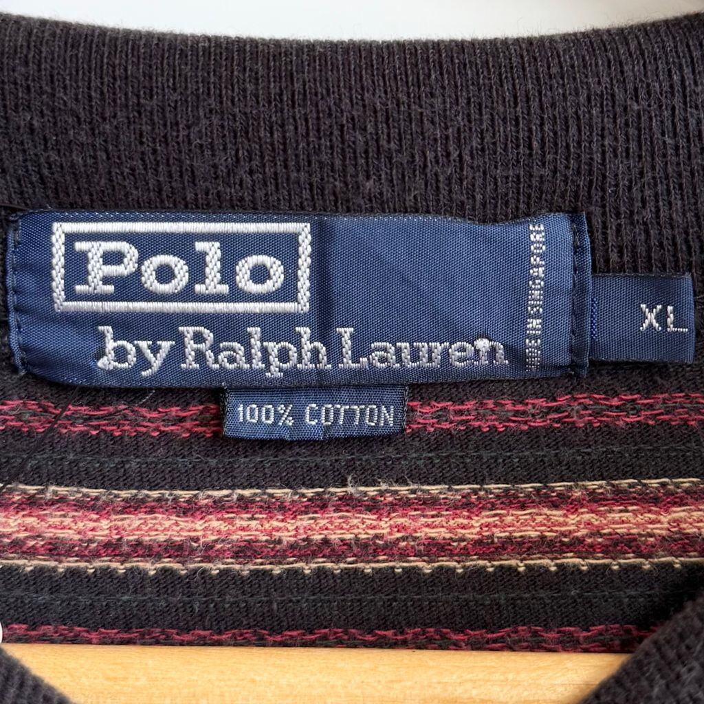 POLO RALPH LAUREN ポロ ラルフローレン ヘンリーネック ハーフボタン ポロシャツ 長袖 柄×ボーダー こげ茶×赤×多色 XLサイズ No.G520