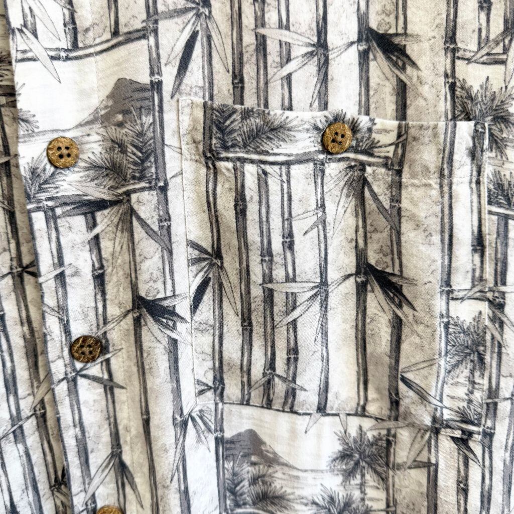 Puritan レーヨンシャツ 竹 笹の葉 山 風景 総柄 柄シャツ デザインシャツ 半袖シャツ 白×ライトグレー×チャコールグレー Mサイズ No.G548