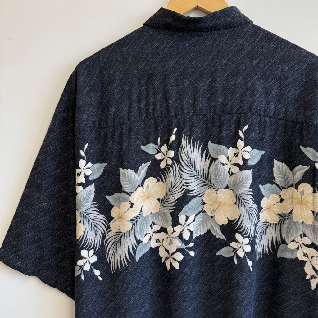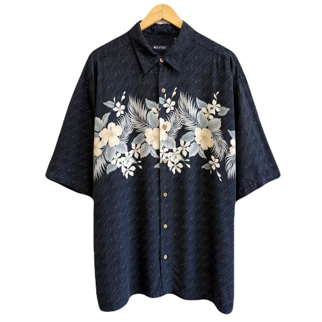 Puritan レーヨンシャツ ハイビスカス 花柄 総柄 柄シャツ デザインシャツ 半袖シャツ 紺×多色 XLサイズ No.G549