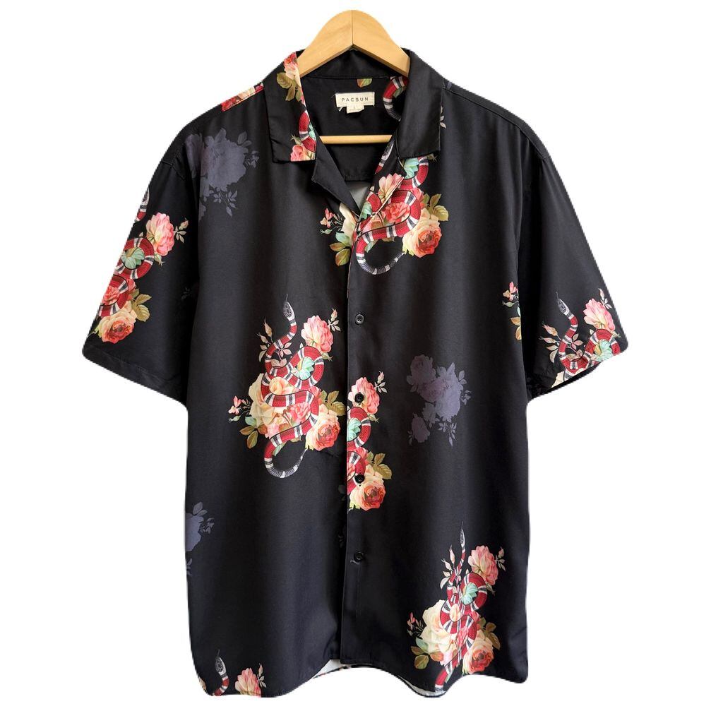 PACSUN ポリシャツ バラ 花柄 蛇 ヘビ オープンカラー 開襟シャツ 半袖シャツ 黒×多色 Lサイズ No.G567