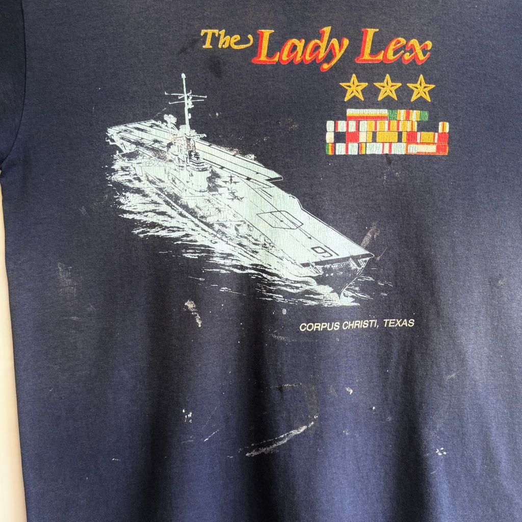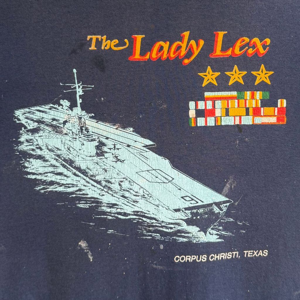 〜90's USA製 Hanes ヘインズ フェード The Lady Lex 航空母艦 星 シングルステッチ 半袖Tシャツ 紺 ネイビー Lサイズ No.G591