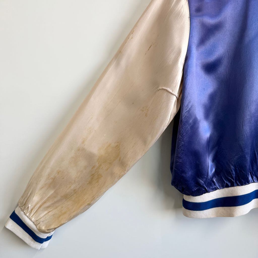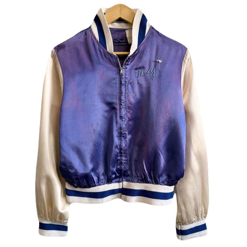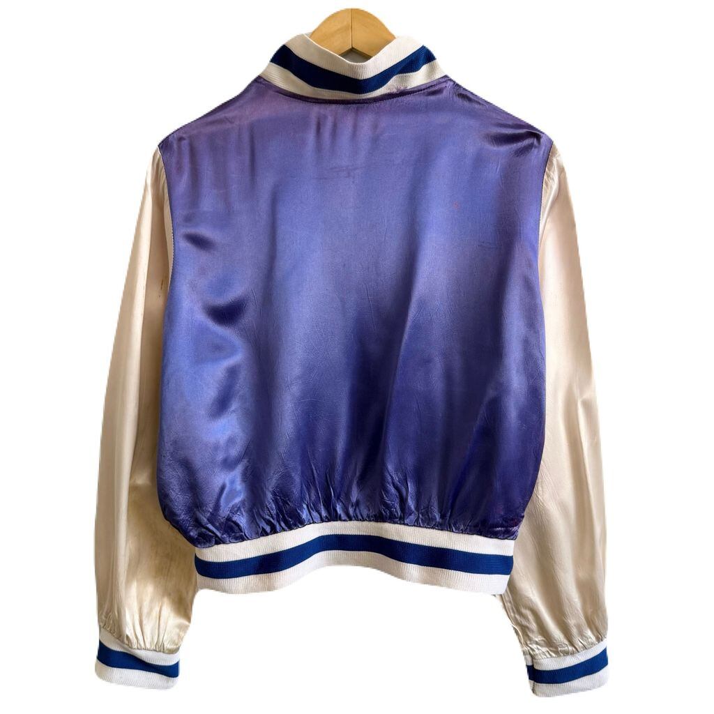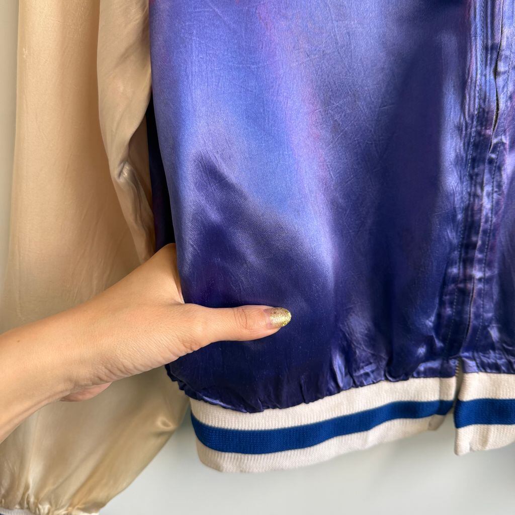 スタジャン リブライン ブルゾン ジャケット フルジップ ポケット付き 刺繍 紫 パープル×白系×青 Lサイズ No.G629