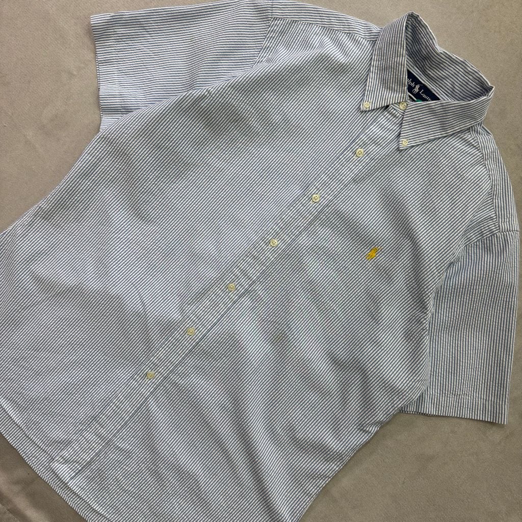 Ralph Lauren ラルフローレン ボタンダウン ストライプ柄 半袖シャツ 水色×白×黄色 Lサイズ No.E662