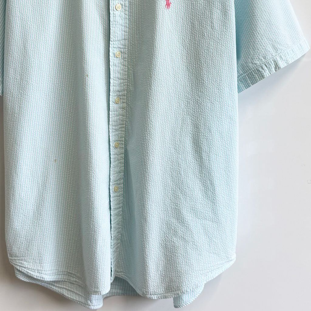 Ralph Lauren ラルフローレン シアサッカー ボタンダウンシャツ コットンシャツ ストライプ 半袖シャツ ワンポイントロゴ 刺繍 白×水色 XLサイズ No.G689