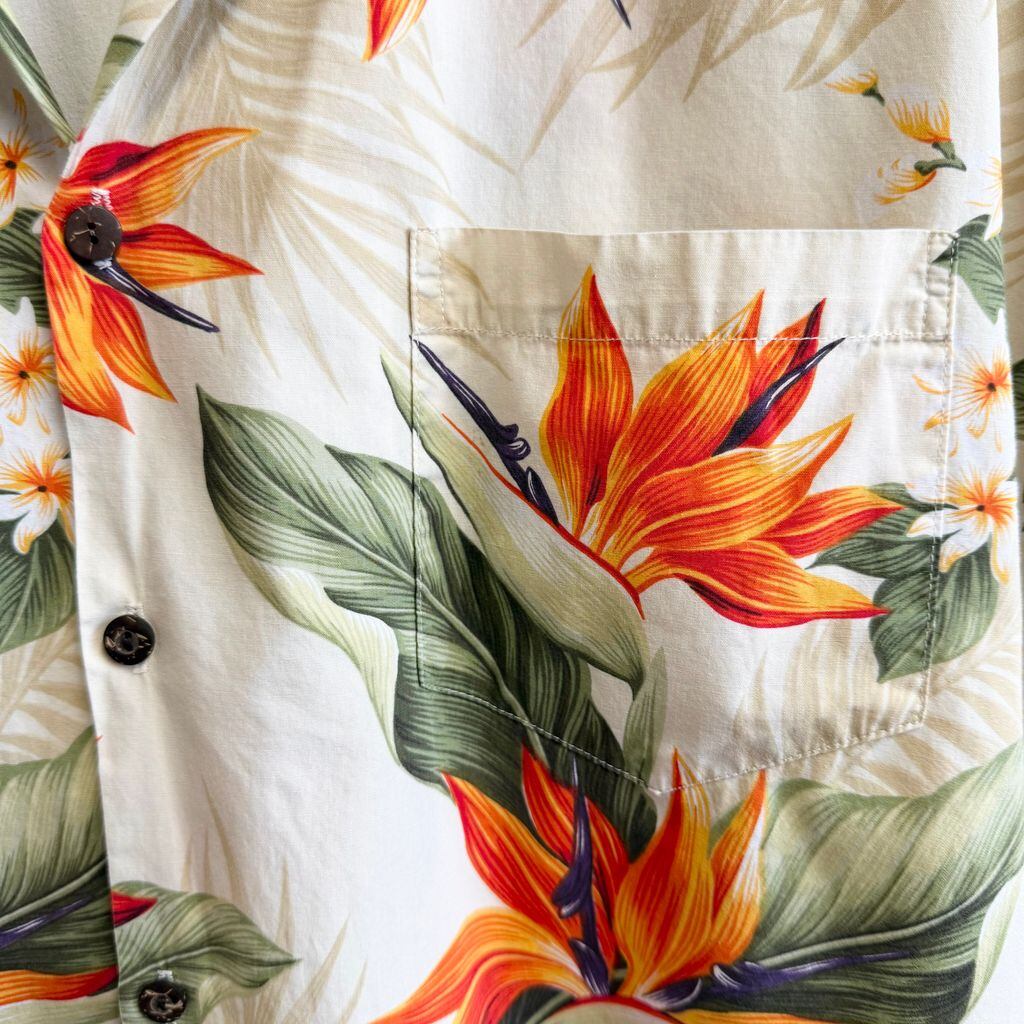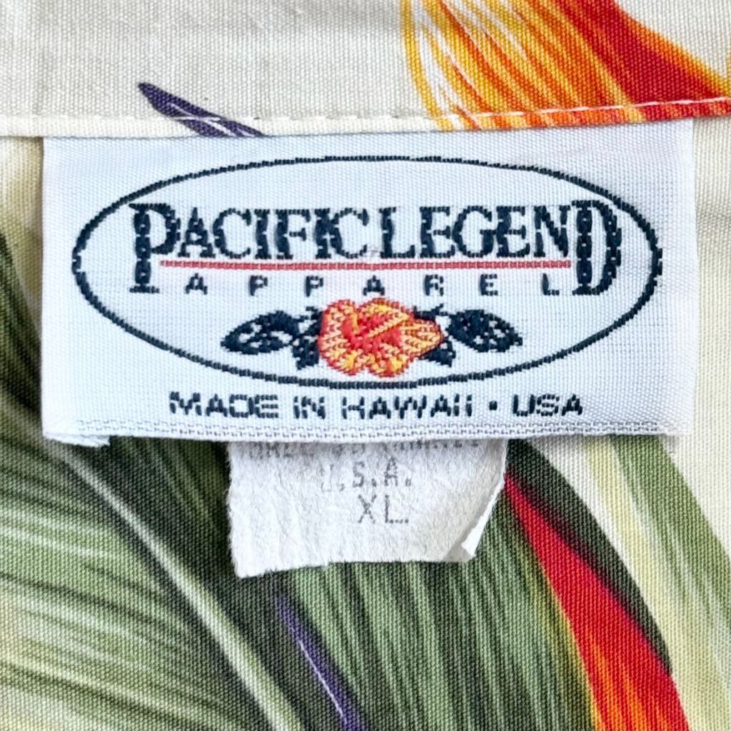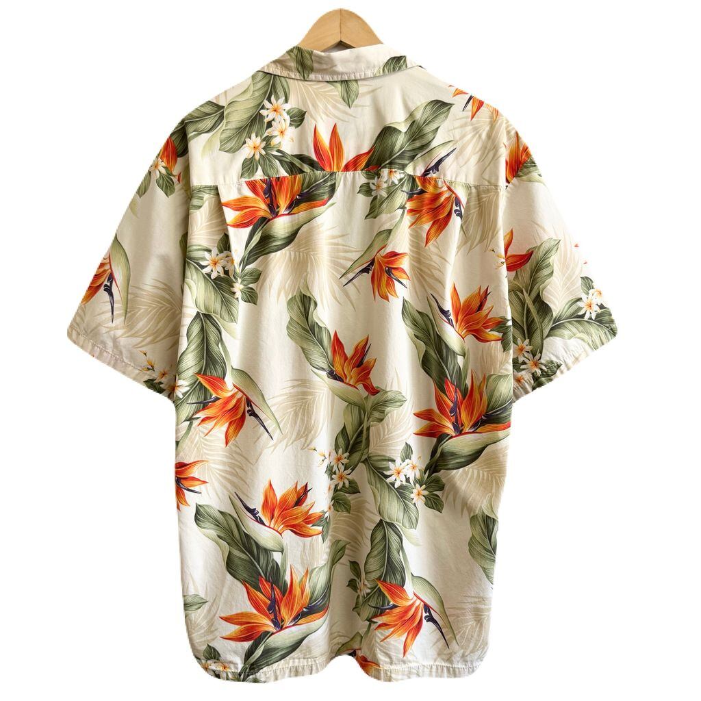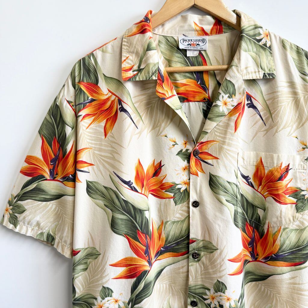 ハワイ製 PACIFIC LEGEND ハワイアンシャツ アロハシャツ オープンカラー 開襟シャツ 花柄 ボタニカル 植物 ベージュ×オレンジ×カーキ×多色 XLサイズ No.G694