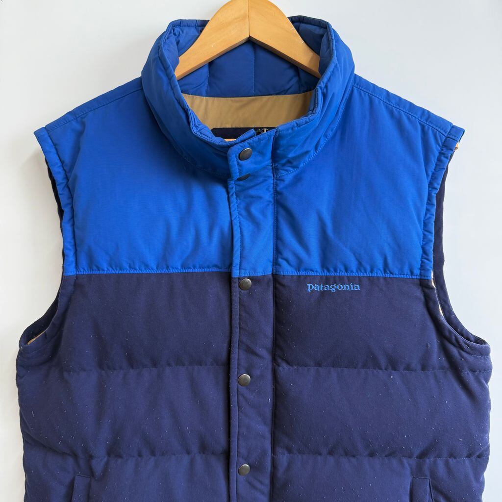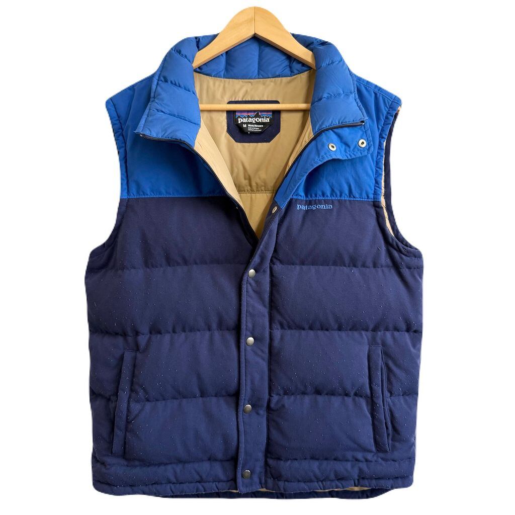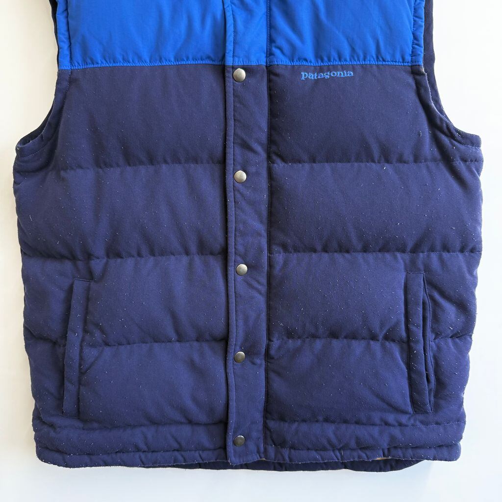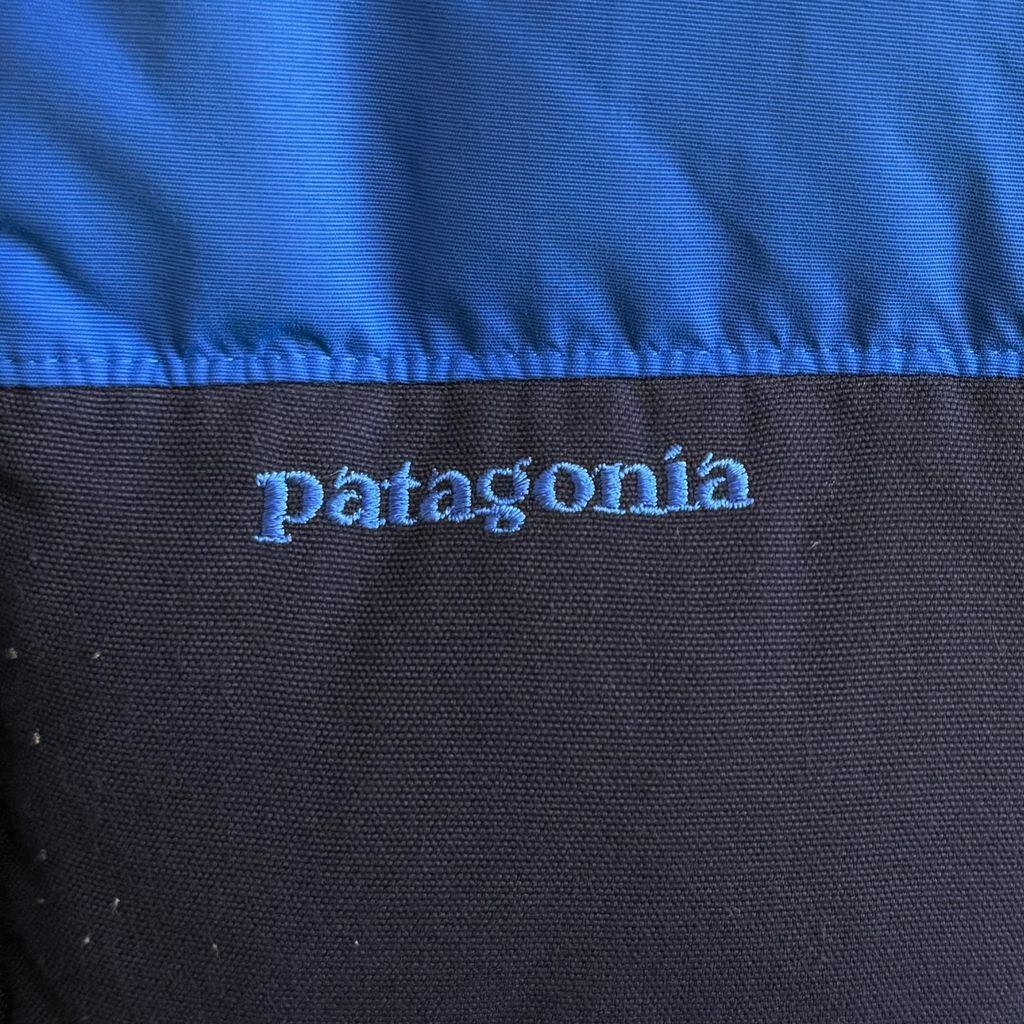 Patagonia パタゴニア ダウンベスト 切り替えデザイン ハイネック フルジップ ポケット付き ワンポイントロゴ 刺繍 青×紺 Mサイズ No.G695