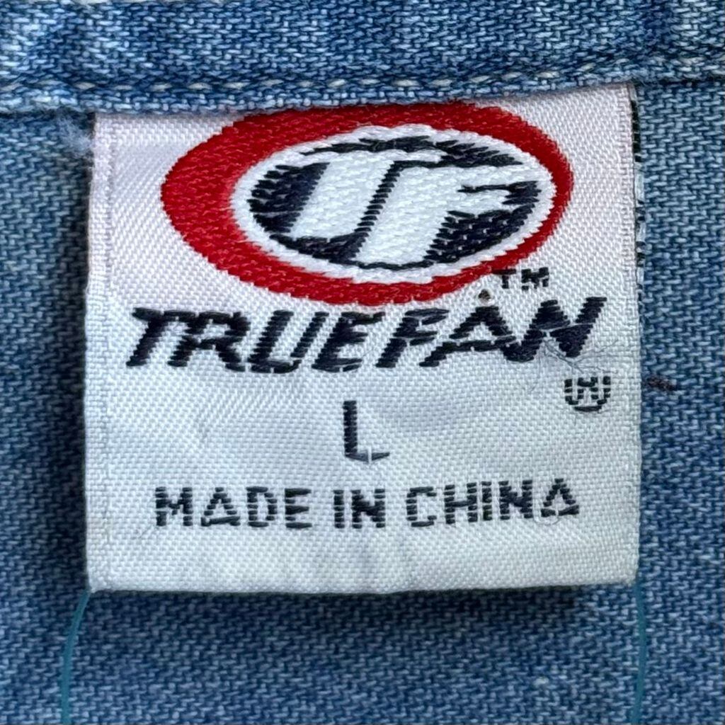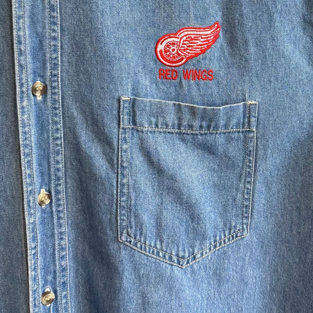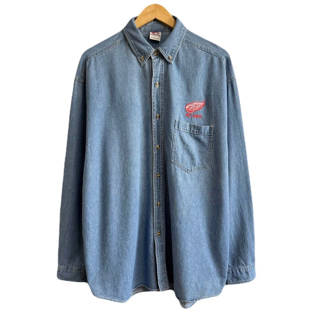 TRUE FAN ボタンダウンシャツ コットンシャツ ポケット付き 長袖シャツ ワンポイントロゴ 刺繍 ワッペン RED WINGS ライトブルー 青 Lサイズ No.G721