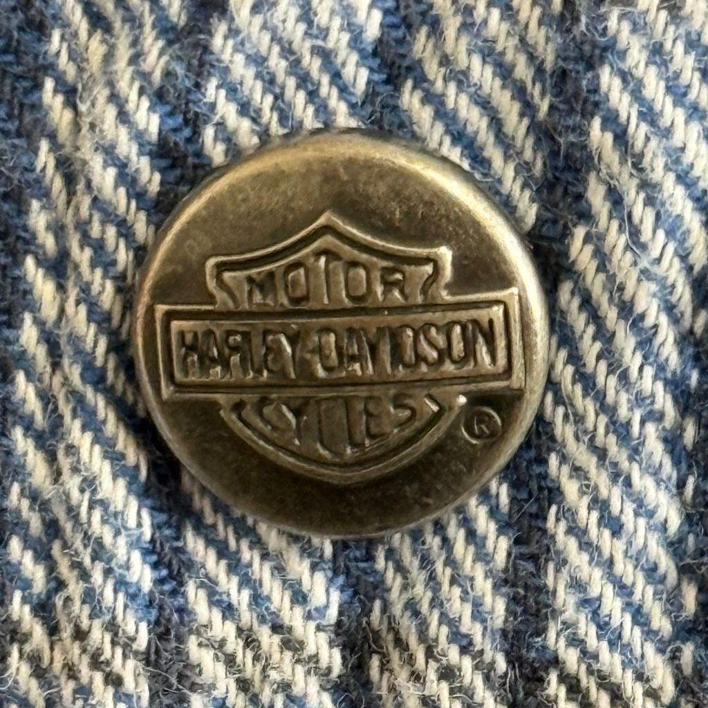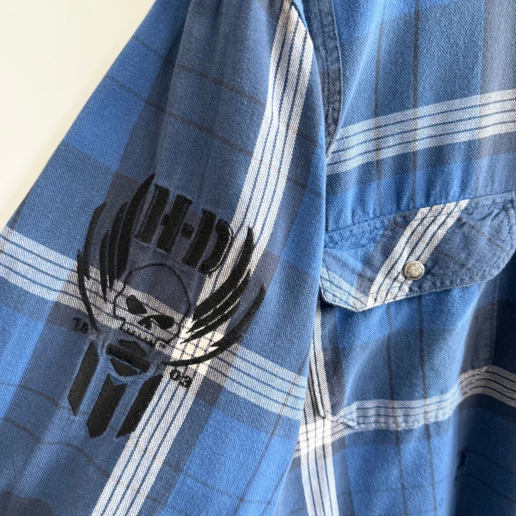 HARLEY DAVIDSON ハーレーダビッドソン チェック柄 ポケット付き 長袖シャツ ロゴ刺繍 ドクロ ガイコツ スナップボタン 青×紺×白×黒 2XLサイズ No.G732
