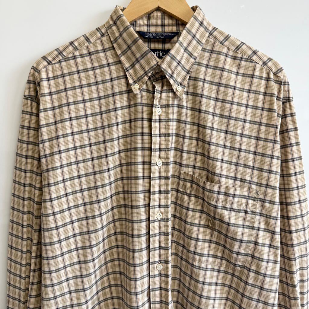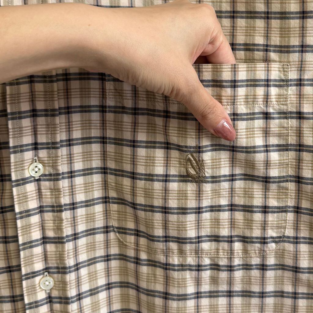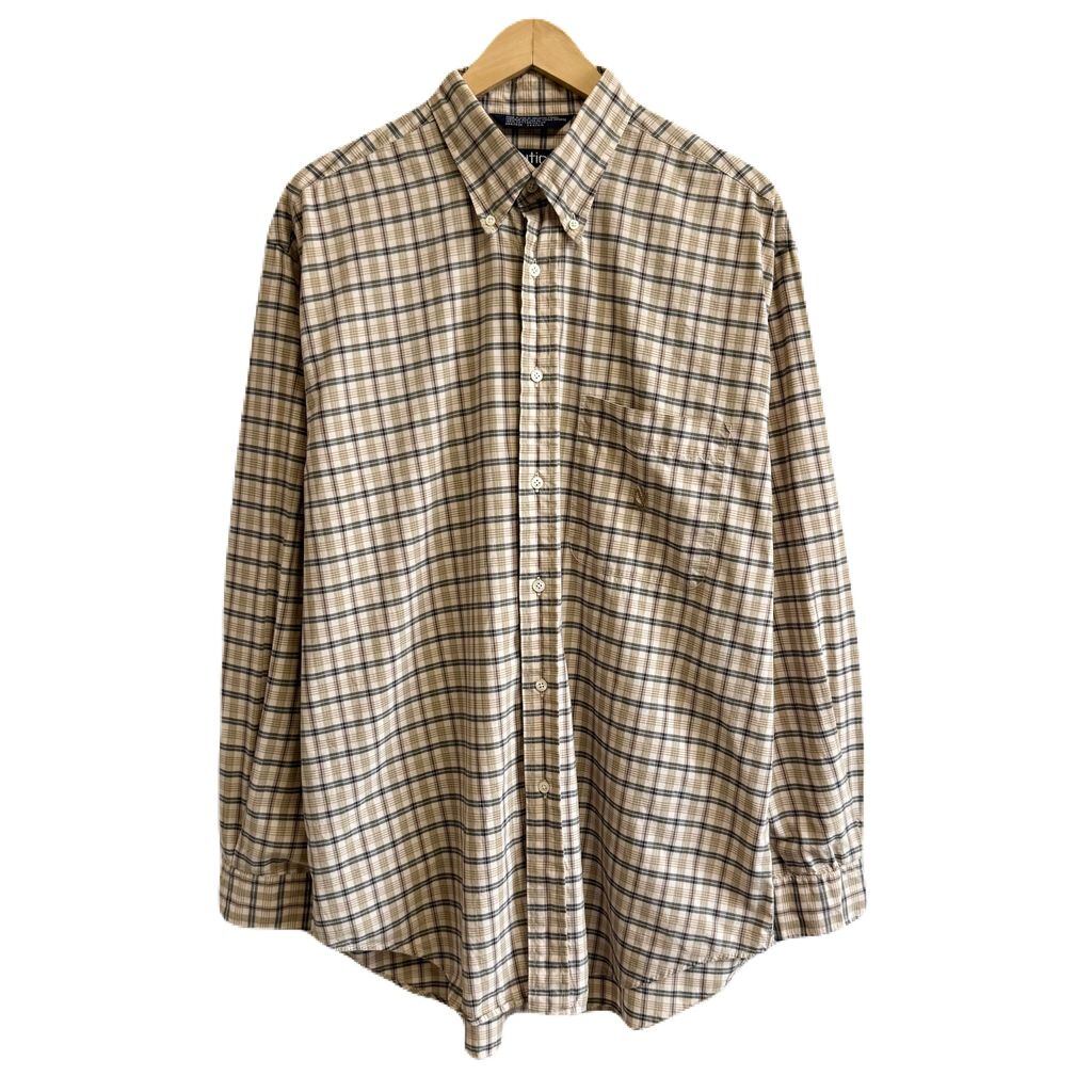 USA製 nautica ノーティカ ボタンダウンシャツ コットンシャツ チェック柄 ポケット付き 長袖シャツ ワンポイントロゴ 刺繍 ベージュ×黒×多色 L/Gサイズ No.G888