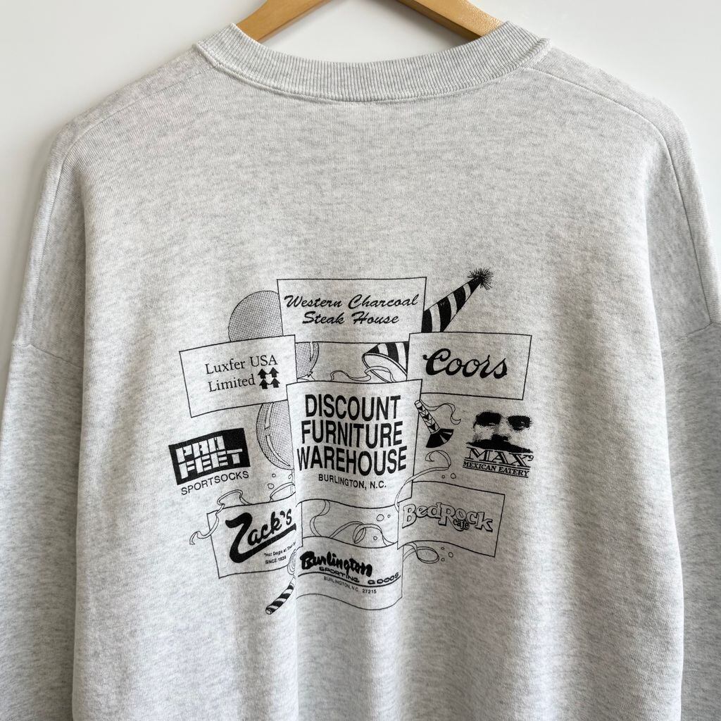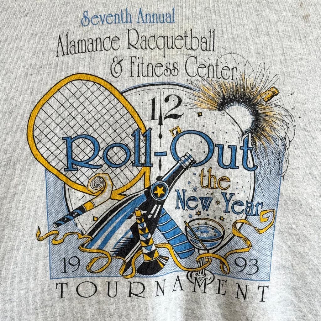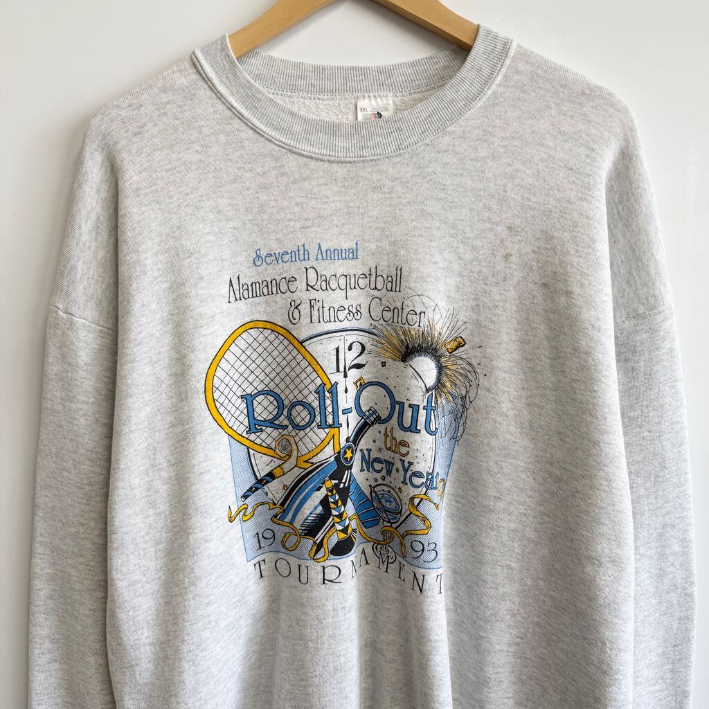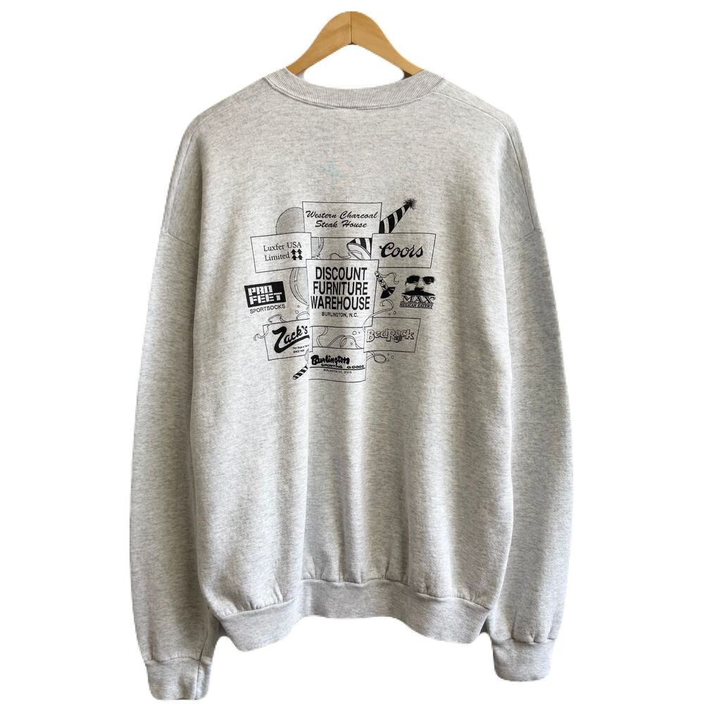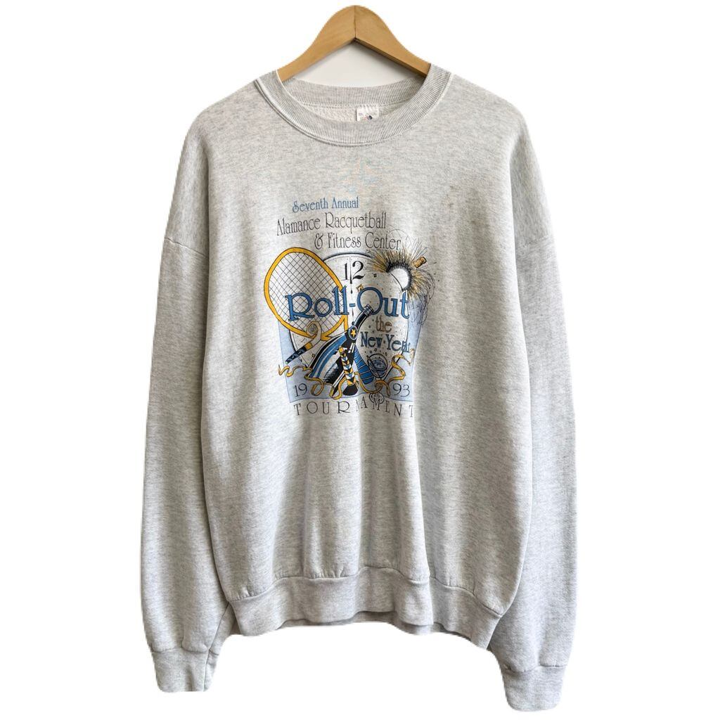 USA製 FRUIT OF THE LOOM フルーツオブザルーム 両面プリント ラケット シャンパン 時計 企業ロゴ トレーナー スウェット ライトグレー XXLサイズ No.H267