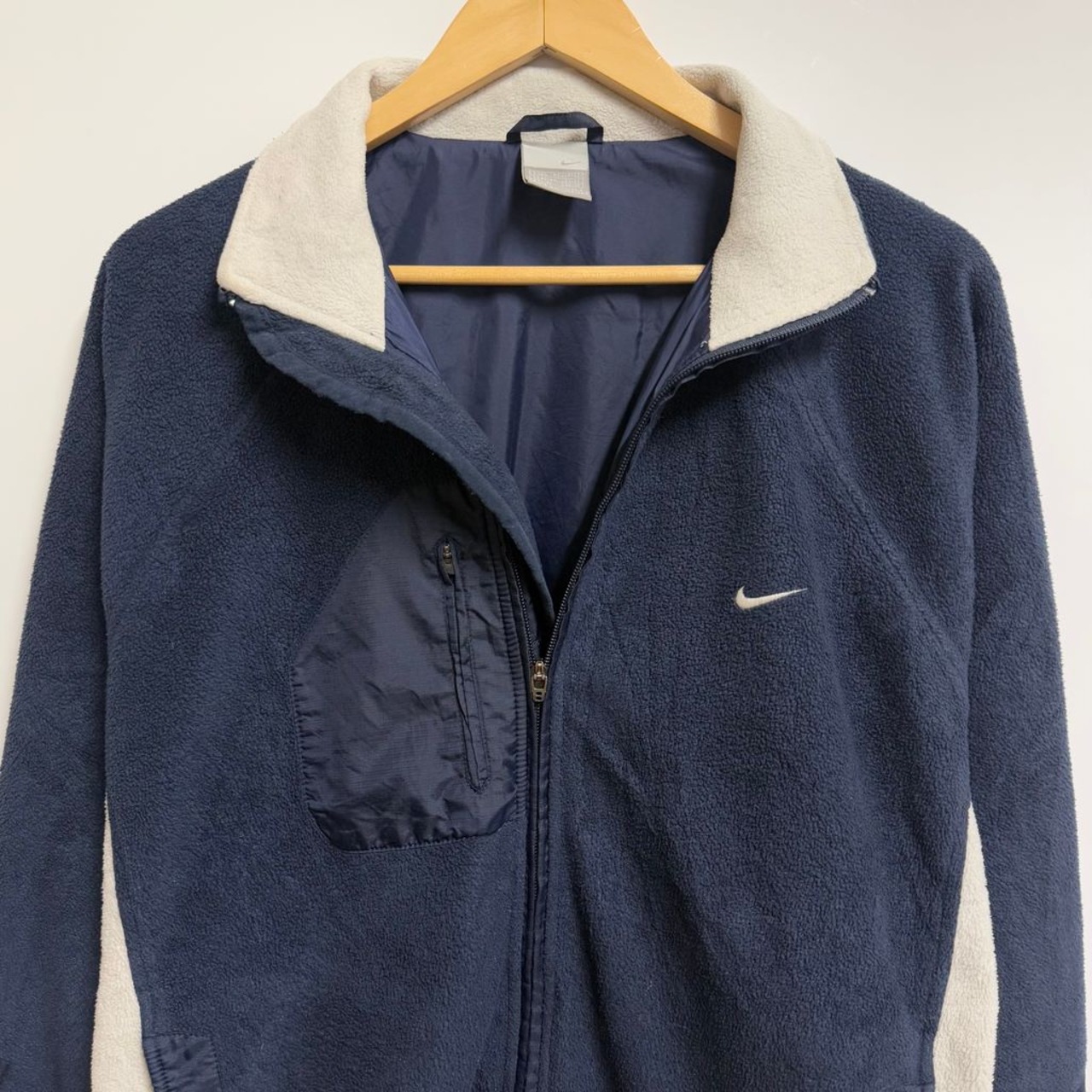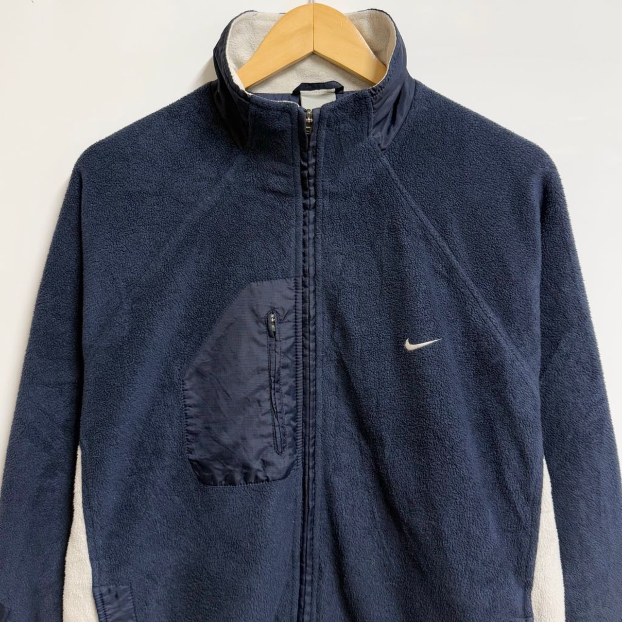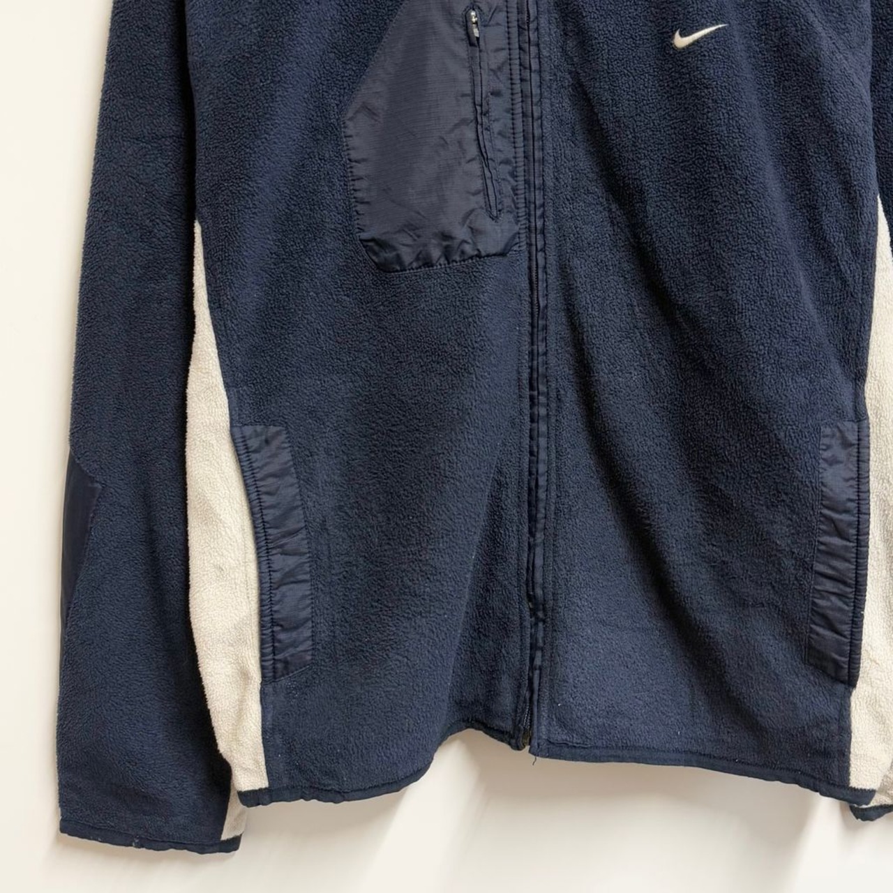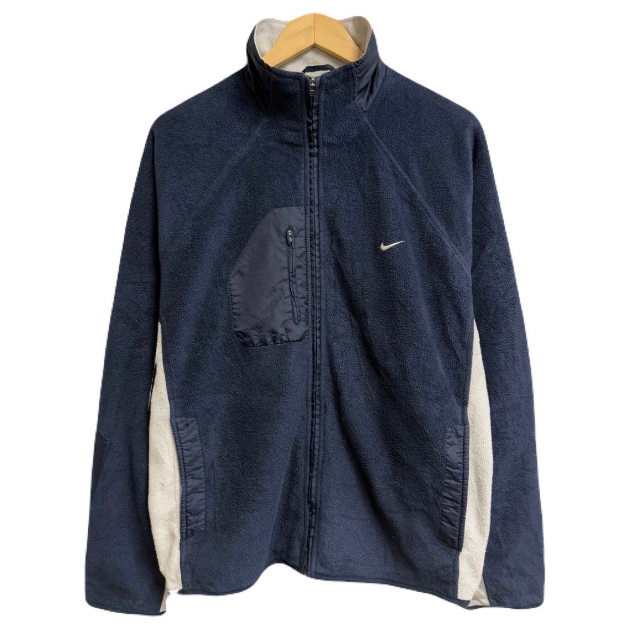 NIKE ナイキ フリースジャケット 切り替えデザイン バイカラー ワンポイントロゴ 刺繍 フルジップ ポケット付き 紺×白 Lサイズ No.H464