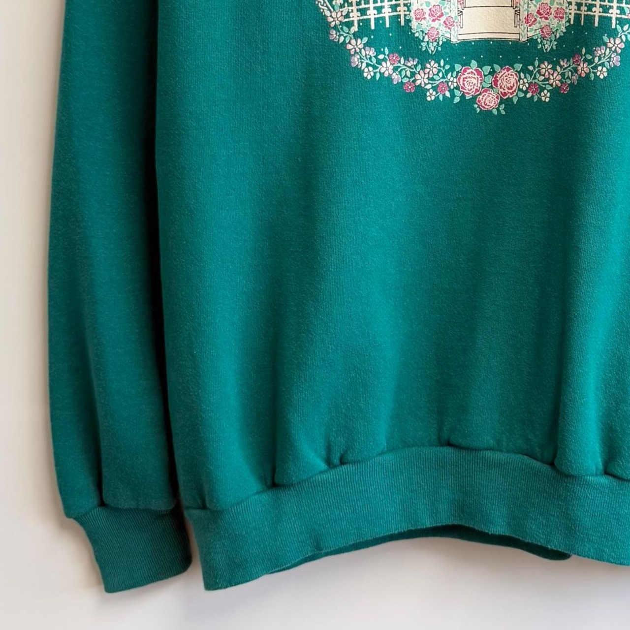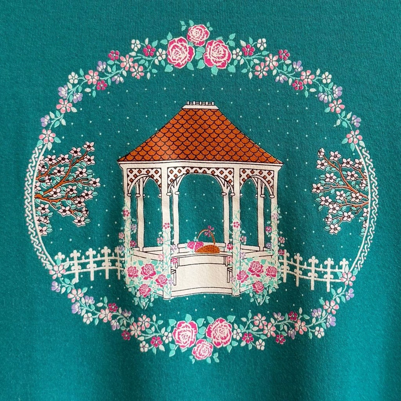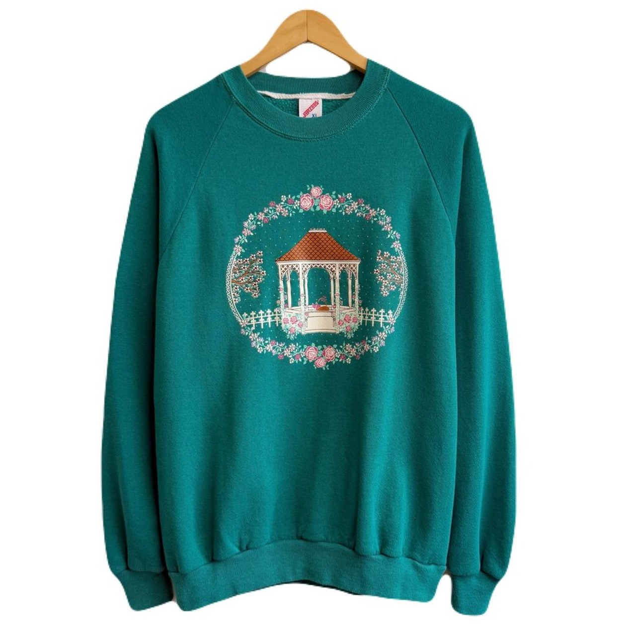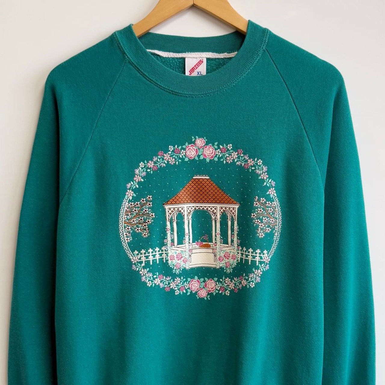 USA製 JERZEES ジャージーズ ガゼボ 花 バラ リース ラグランスウェット トレーナー 裏起毛 エメラルドグリーン XLサイズ No.H488