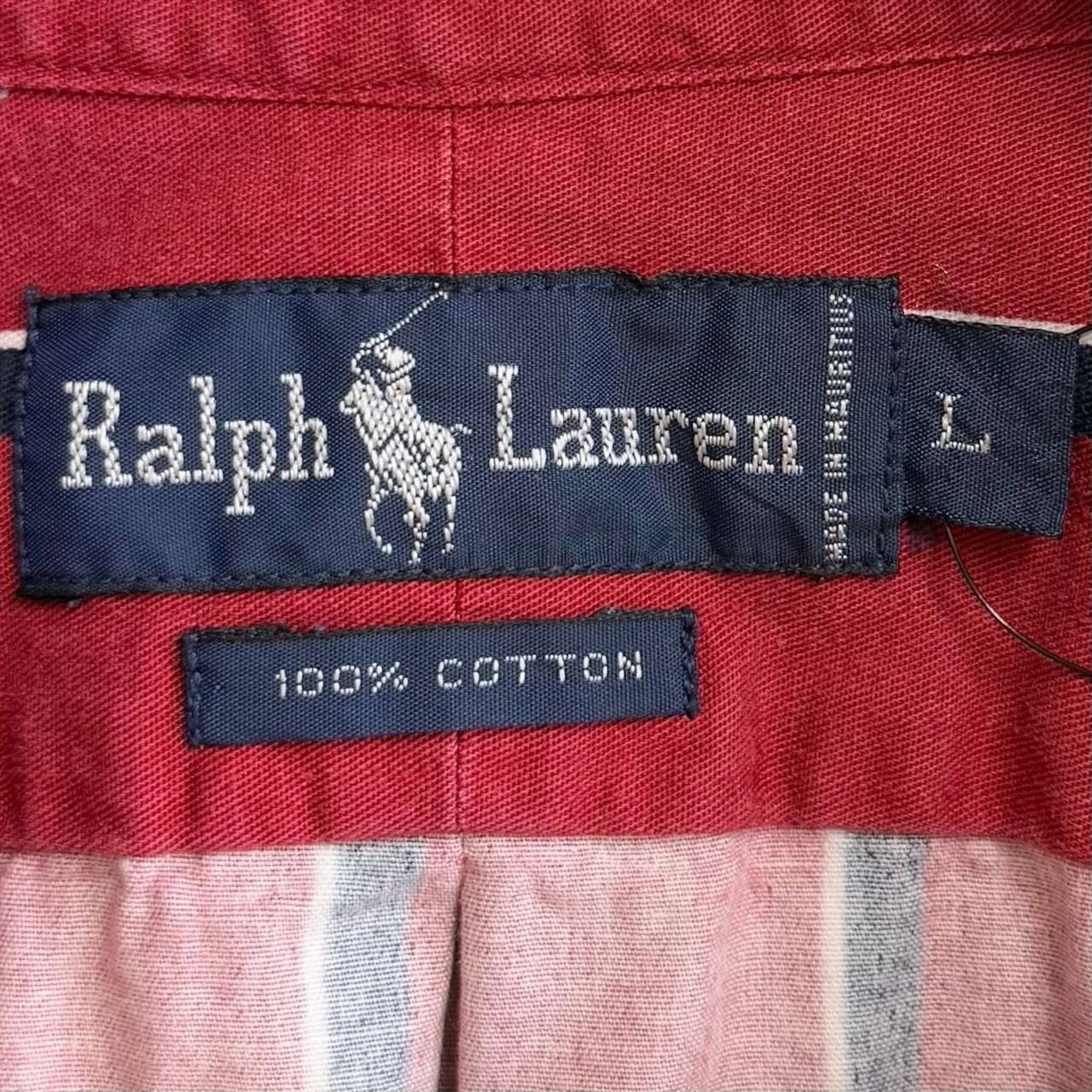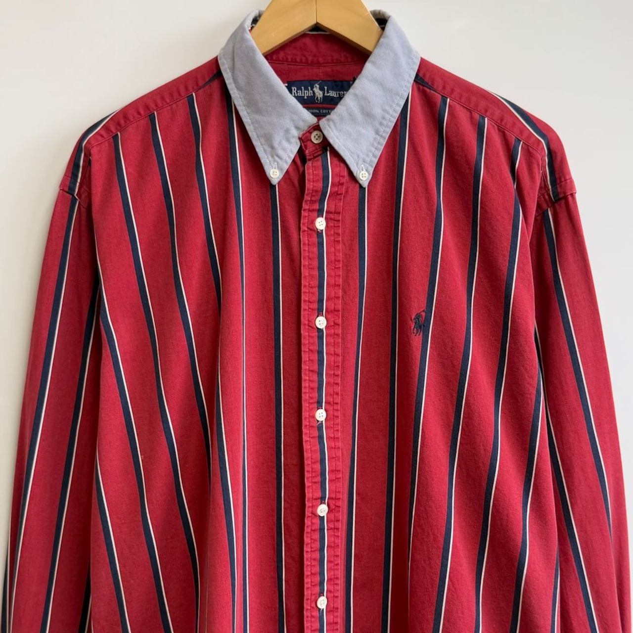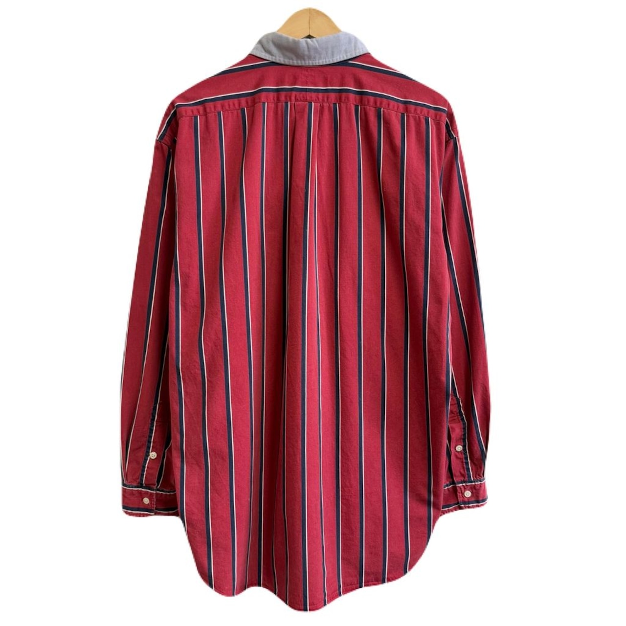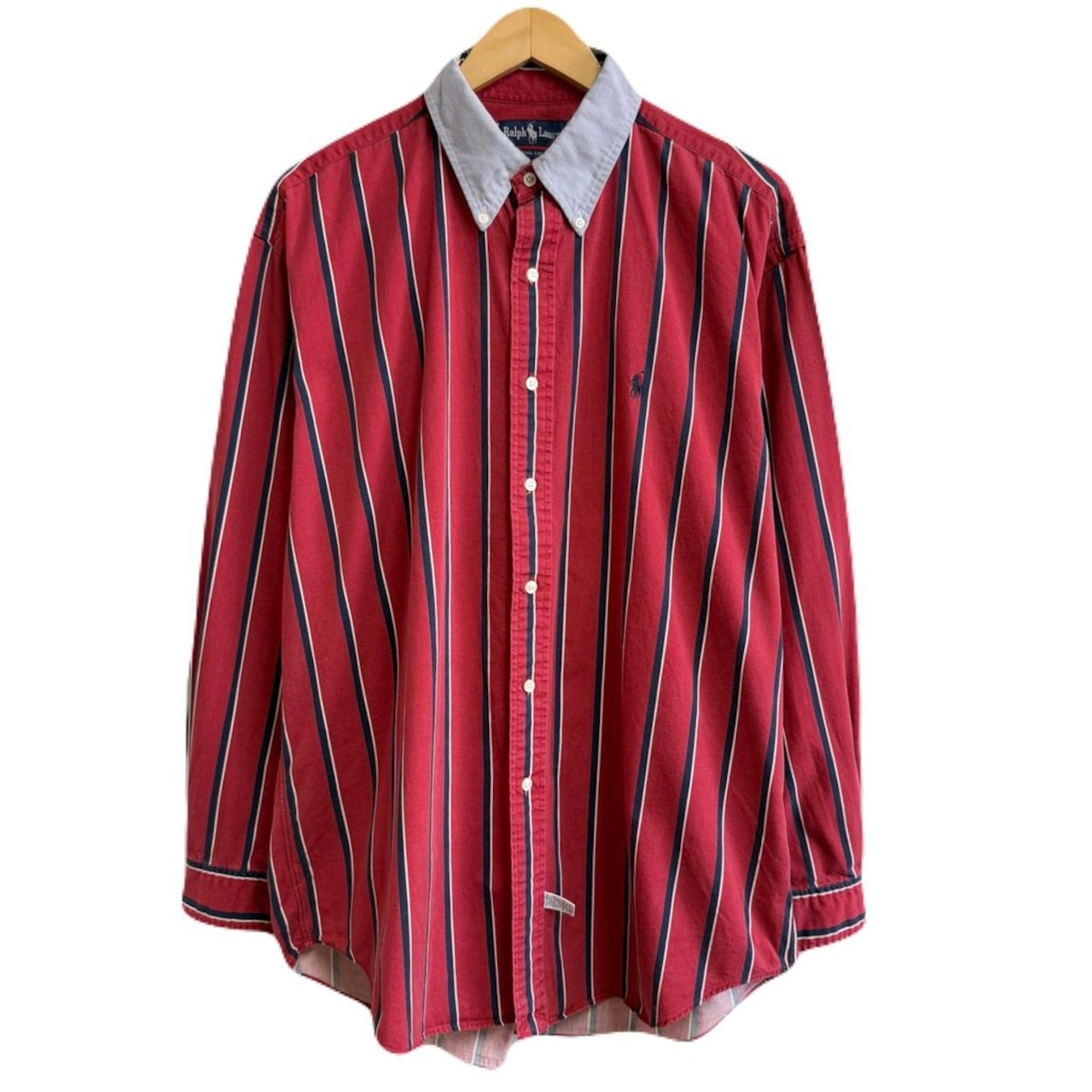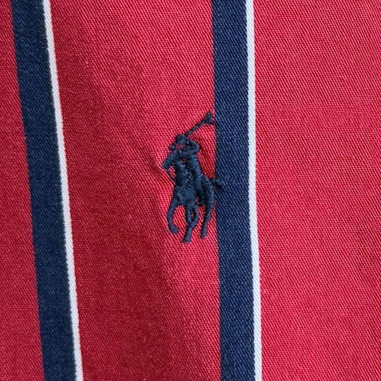 Ralph Lauren ラルフローレン 切り替えデザイン ボタンダウンシャツ コットンシャツ ストライプ 長袖シャツ ワンポイントロゴ 刺繍 赤×紺×白×ライトブルー Lサイズ No.H505